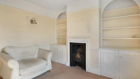 Sitting Room Window to the front. Attractive feature fireplace with wooden surround and mantelpiece built in storage cupboards to sides with shelves over.
