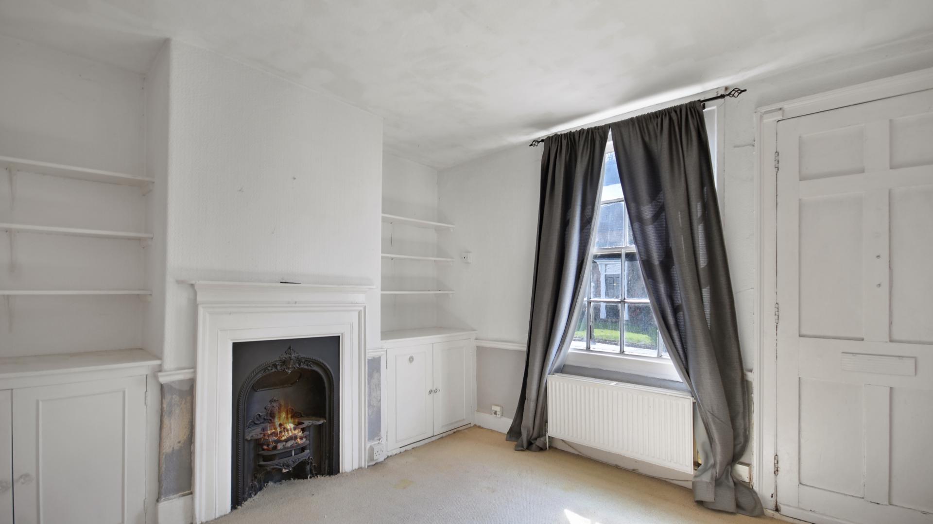 Bedroom One: Window to the front. Attractive feature fireplace with wooden surround and mantelpiece. Built in cupboard.