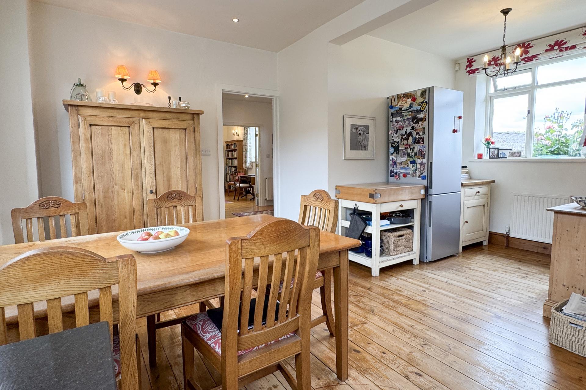 At the heart of the home is a bright and spacious kitchen with painted grey shaker units, granite worktops, and an Everhot electric range. Multiple windows flood the room with light and frame outstanding countryside views. A separate utility room offers further storage, a Belfast sink, granite surfaces, and access to the parking area, with two bays in the barn. The large, welcoming sitting room centres on an open fireplace, with French doors leading to two outdoor areas: a neatly maintained lawned garden with a small patio, and a sheltered walled courtyard garden with log store and gated driveway access—both ideal for outdoor dining and relaxation.