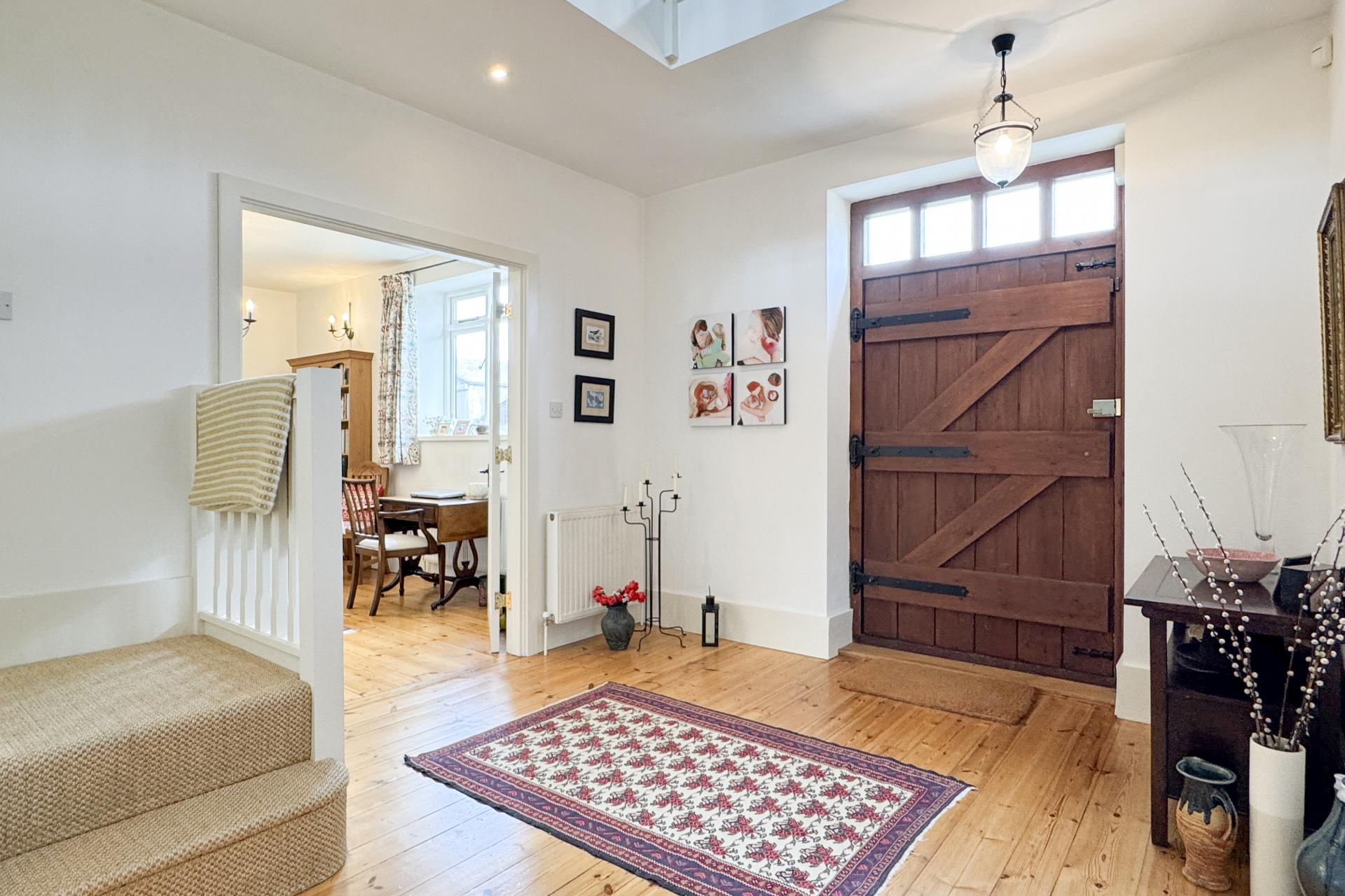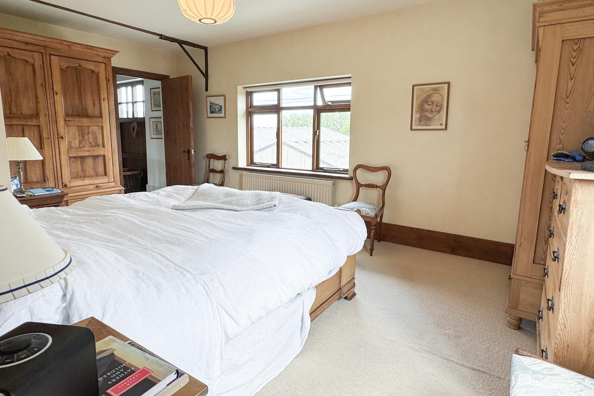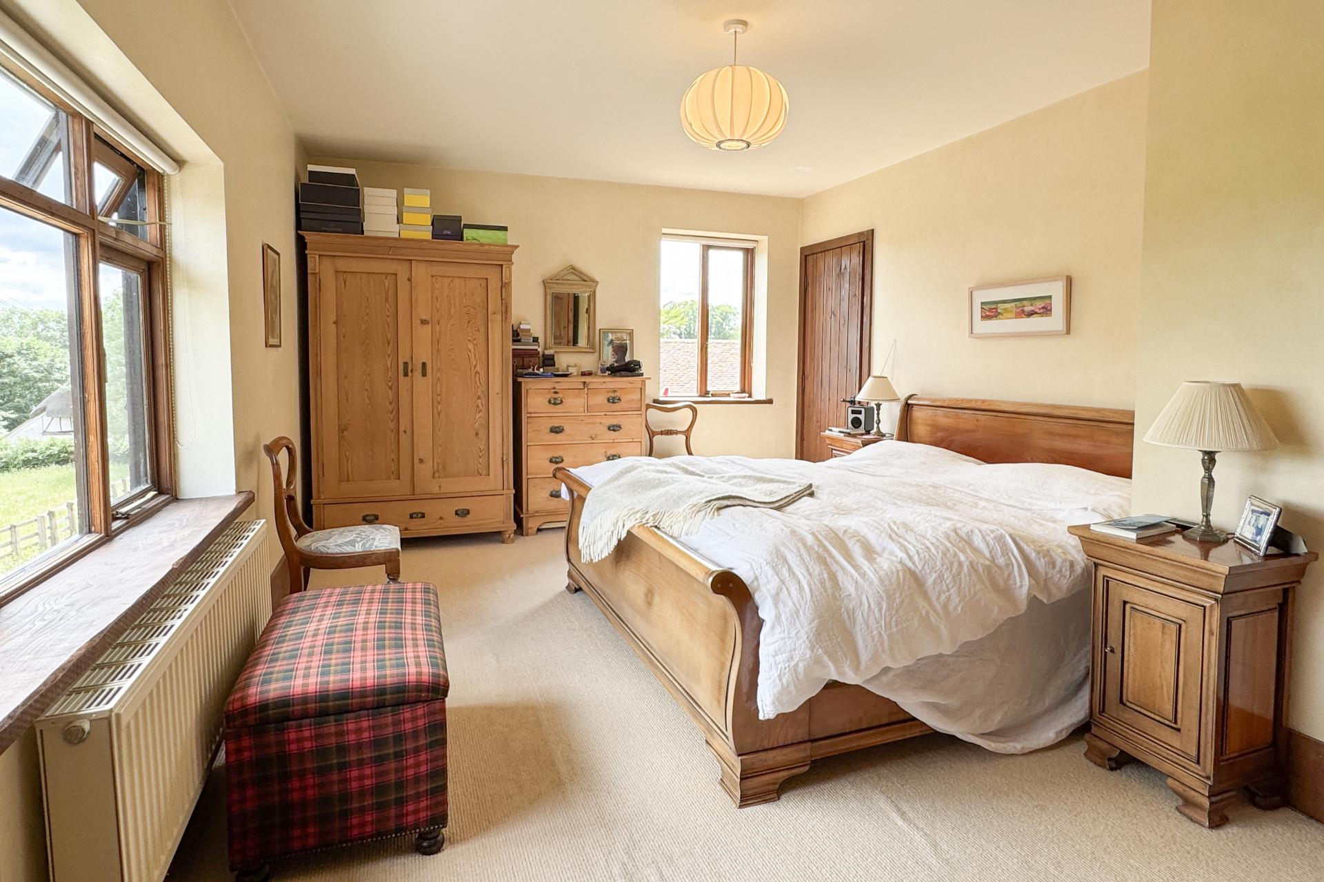 Upstairs, a vaulted landing leads to four generous double bedrooms. The principal suite features dual-aspect windows, countryside views, and an en suite shower room. Two rear bedrooms overlook the garden, while the fourth enjoys a stunning front-facing view. A stylish family bathroom completes the floor, with a roll-top bath and traditional fittings. The Hayloft is serviced by mains gas, private drainage (Klargester), and high-speed broadband. No onward chain.