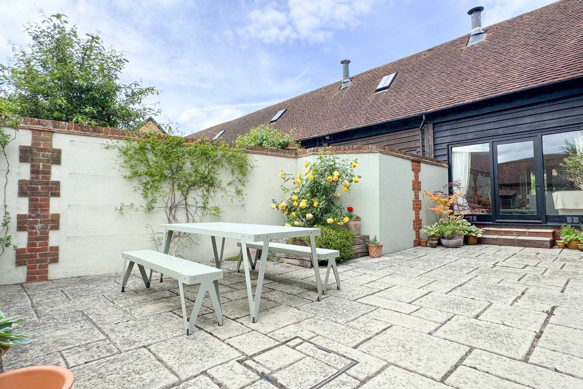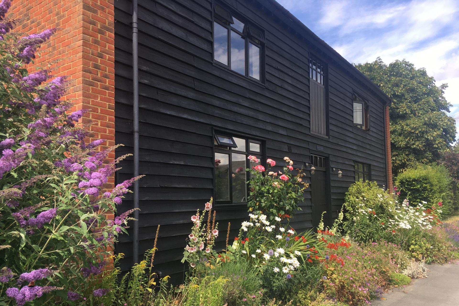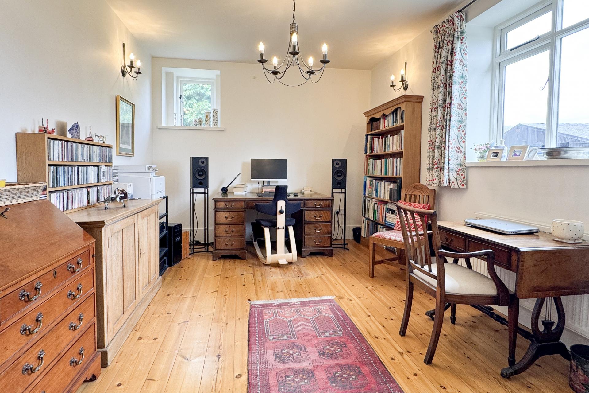 The Hayloft is tucked away in a peaceful rural setting with sweeping views towards the Chiltern Hills, a beautifully converted character home forming part of a late Victorian farmstead. Formerly used for storing hay, the building was thoughtfully converted in 1998 and retains striking original features, including exposed A-frame beams and a vaulted landing. One window still marks the former hay-loading opening—now a unique architectural detail. The wide front door opens into a light-filled entrance hall with pine floorboards and a soaring gallery ceiling. To the left is a cloakroom and staircase, while to the right, a spacious reception room, (currently a home office) enjoys far-reaching views across open farmland to the Chilterns and would also suit use as a formal dining room.