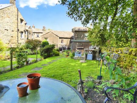 To the rear of the property is a communal yard, one stone outbuilding, with steps leading up to a substantial south-facing garden. The South facing garden is open to the fields beyond, and is mainly laid to lawn, complemented by a patio area and a timber shed – ideal for outdoor entertaining or simply enjoying the peaceful surroundings.