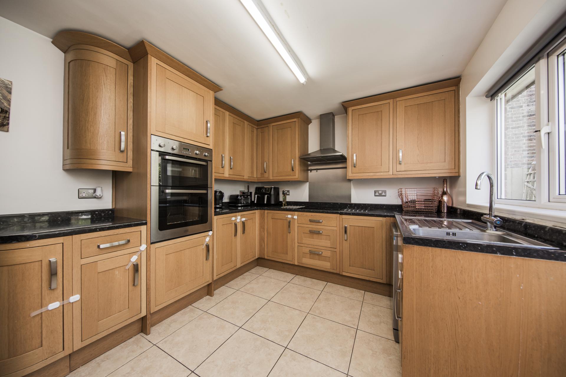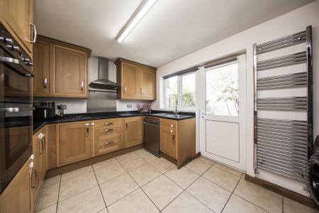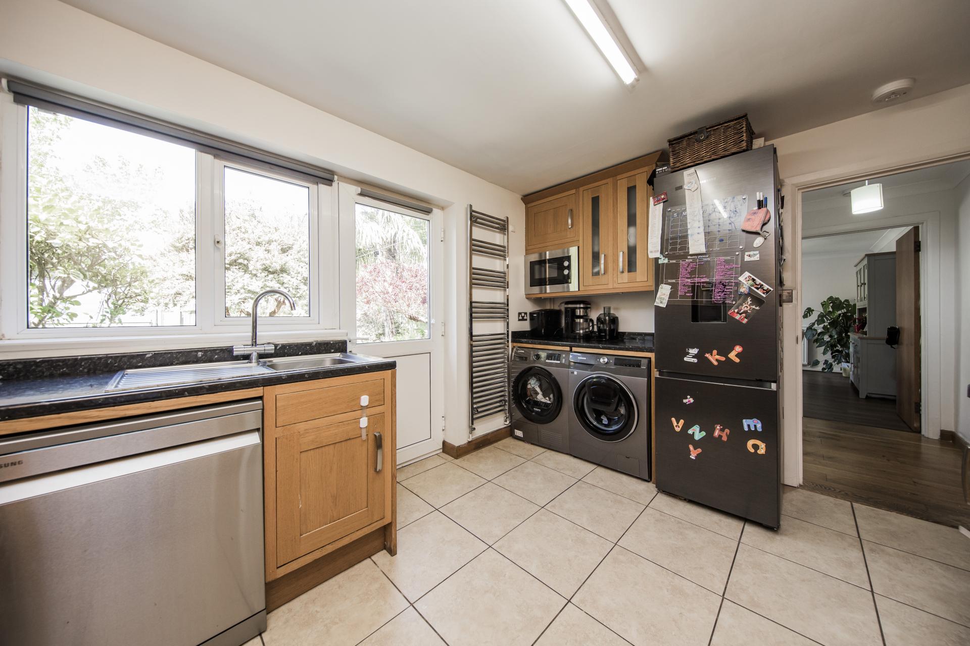 To the rear of the home, the dining room enjoys a tranquil aspect over the garden and is flooded with natural light thanks to large sliding doors that open directly onto the patio. This connection between indoor and outdoor living adds to the property's appeal, especially during the warmer months. Adjacent to the dining room, the kitchen is fully equipped with a comprehensive range of fitted cabinetry and space for all the necessary appliances, providing a functional layout that can easily be adapted or upgraded to suit personal taste.