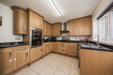 KITCHEN: Fitted with wall and floor cabinets with contrasting work surface and riser. Sink with mixer tap and drainer. Halogen hob with extractor hood and stainless steel splashback, double eye-level oven and integrated microwave. Space and plumbing for washing machine, tumble dryer, dishwasher and fridge/freezer. Tiled flooring. Double glazed window to rear and double glazed door to garden.