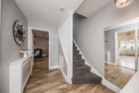 INNER HALLWAY: Covered radiator, central heating thermostat and stairs to first floor with cupboard beneath. Door to:
