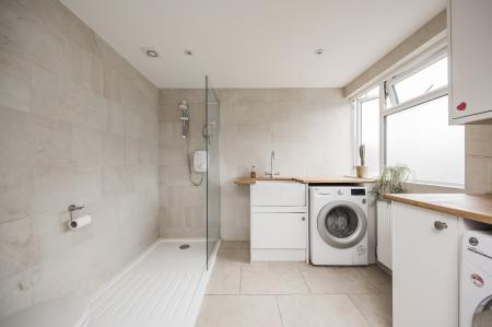 UUTILITY/SHOWER ROOM: White low level wc, walk-in shower, fitted electric wall shower, deep white Butler style sink with mixer tap. Space for washing machine and tumble dryer and work surface above. Wall cupboards, tiled flooring, single radiator, ceiling downlights, extractor fan. Window to rear.