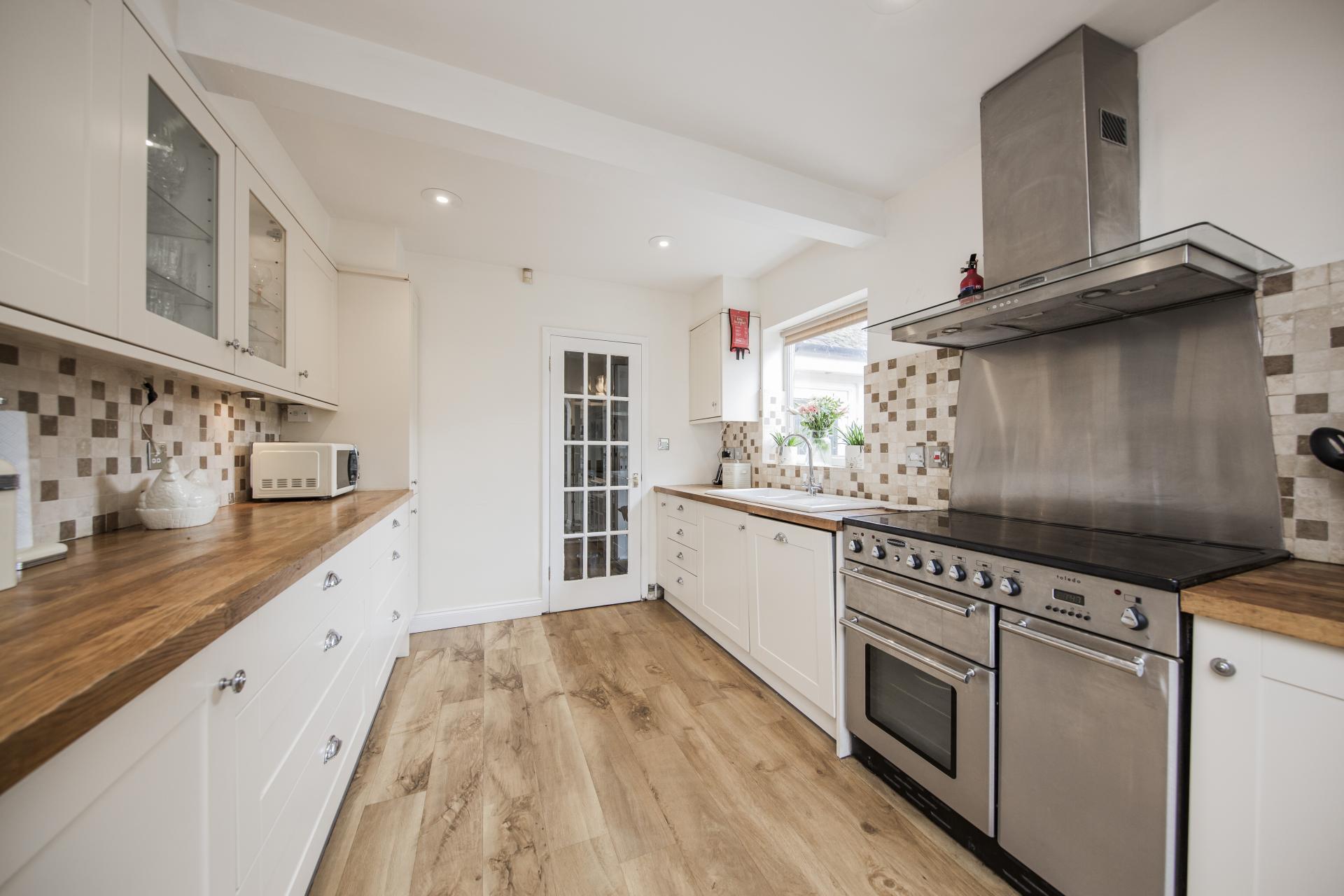 KITCHEN/BREAKFAST ROOM: Fitted with a range of wall and base units with wood block work surfaces. Enamel one and a half bowl single drainer sink unit with mixer tap. Rangemaster electric cooker with large filter hood above. Space for standing a large fridge/freezer. Integrated dishwasher. Tiling adjacent to worktops, wood flooring, single radiator. Bay window to front and window to side. Door to:
