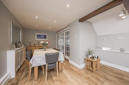 SITTING ROOM: A generous room with partially vaulted ceilings fitted with Velux style windows and exposed timber beams, wood flooring, two radiators with decorative covers, power points, TV point. Tri-folding double glazed doors and further double glazed French door with side window open to the rear garden.