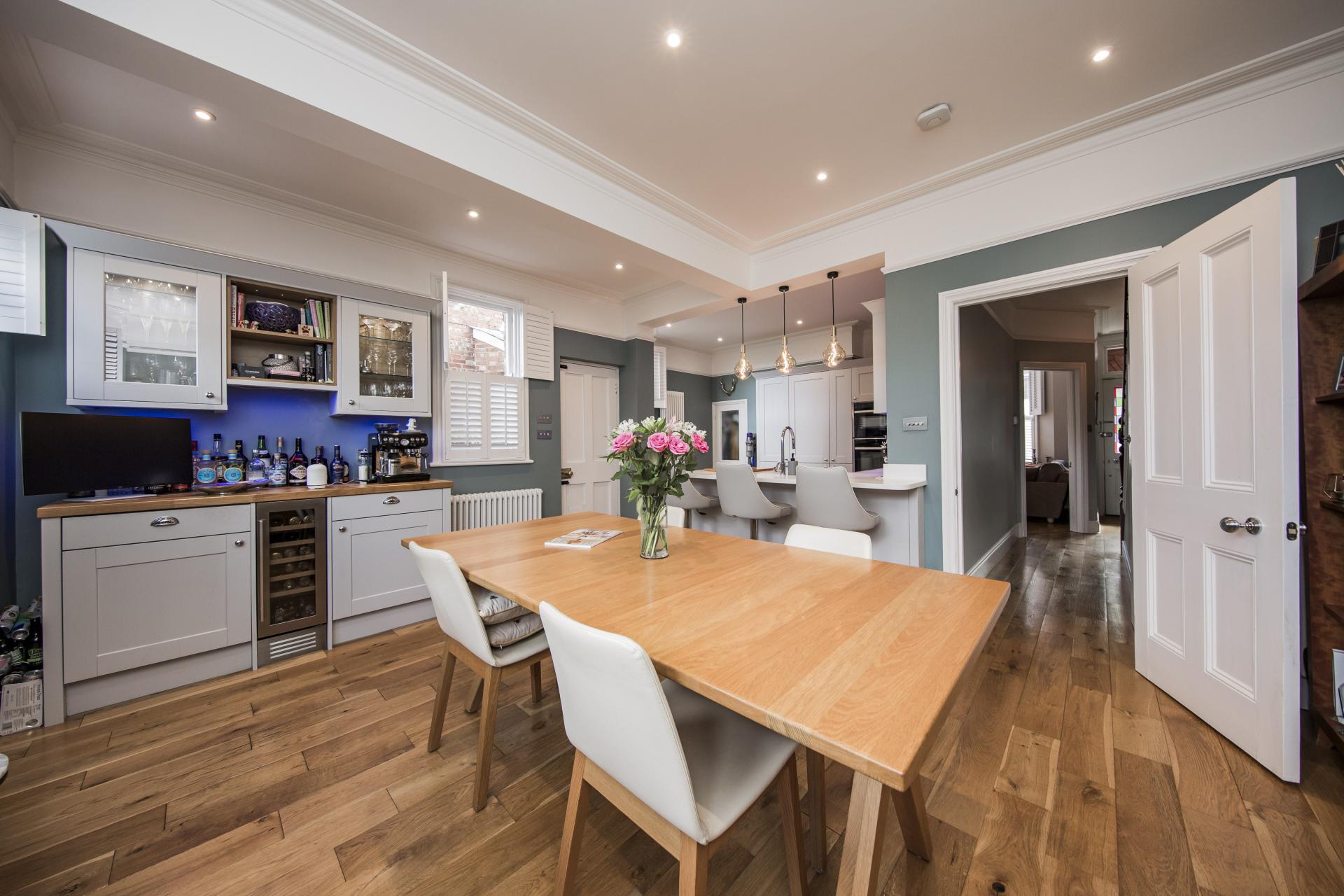At the heart of the home, the kitchen and dining room is a statement in both design and practicality. Bay and sash windows flood the room with light, while the solid wood flooring, plantation shutters, and detailed cornicing create an atmosphere of period grandeur. The bespoke cabinetry is complemented by quartz worktops, tiled splashbacks, and a comprehensive range of integrated appliances, including dual eye-level 'Neff' ovens, induction hob, extractor, and fridge/freezer. A practical boiler room provides further utility and storage space.
