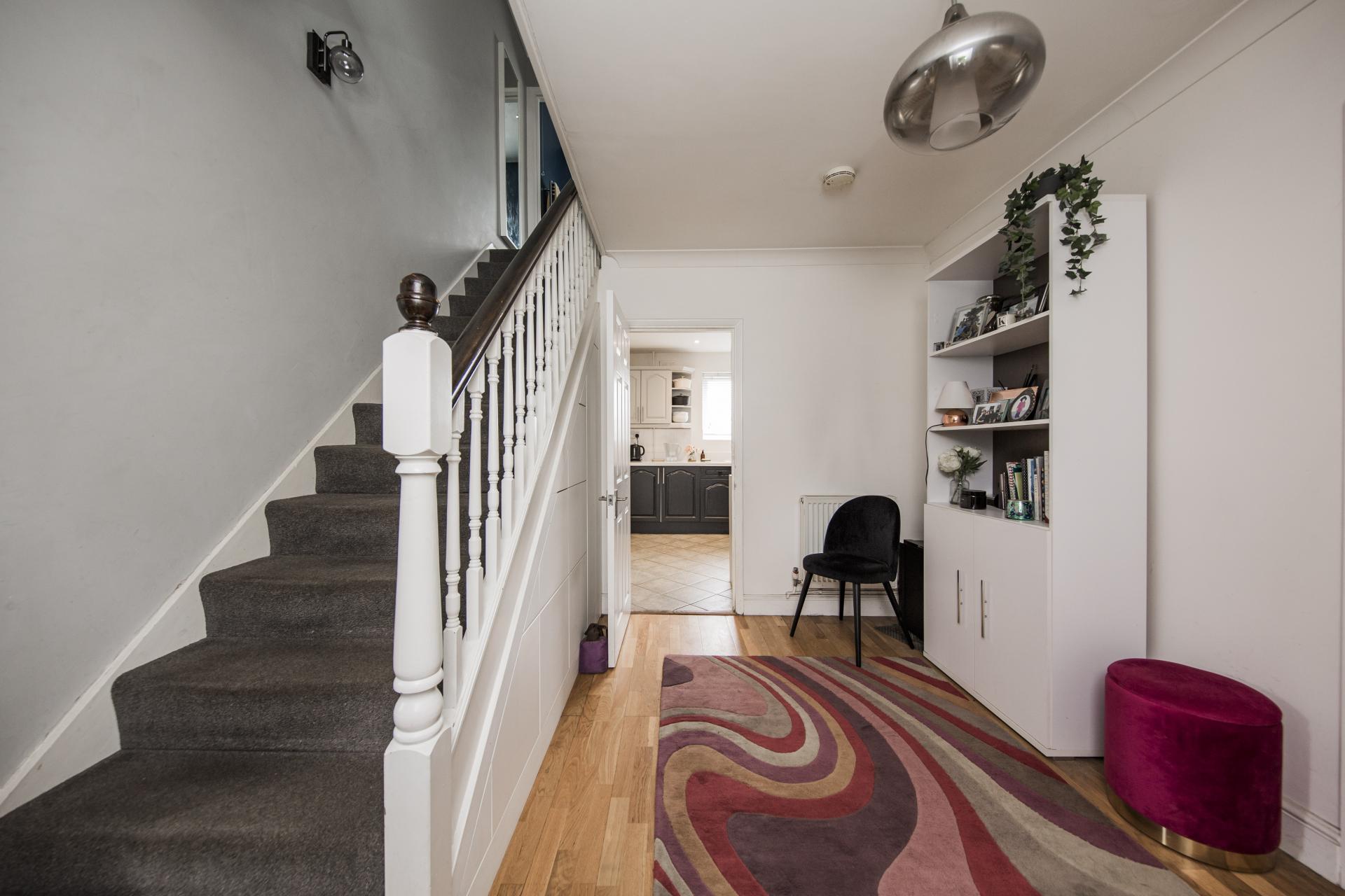ENTRANCE HALL: Spacious hallway with solid wood flooring, understairs cupboard, shoe storage, radiator, stairs to first floor.