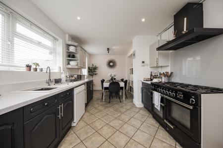 KITCHEN/DINING ROOM: Two double glazed windows to rear, fitted with two tone cabinetry with contrasting work surface and riser, space and plumbing for dishwasher, fridge/freezer, space for range cooker with extractor hood above, larder cupboard, ceiling spot lights, radiator, tiled flooring.