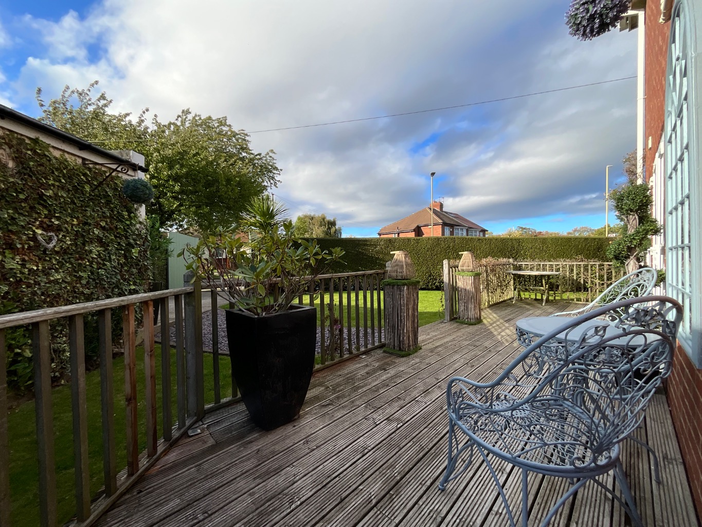 Externally, the home enjoys beautifully maintained private gardens, with lawned and decked areas providing multiple spaces for relaxation, play, or entertaining. To the rear sits a detached garage and a driveway offering ample off-street parking.