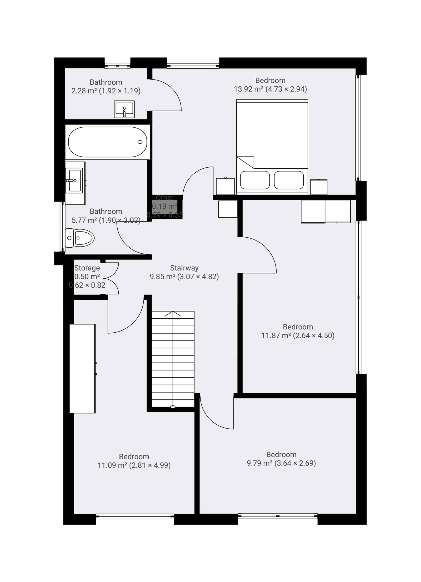 First floor four bright double bedrooms all with large picture windows, master with en-suite shower room. Family bathroom.