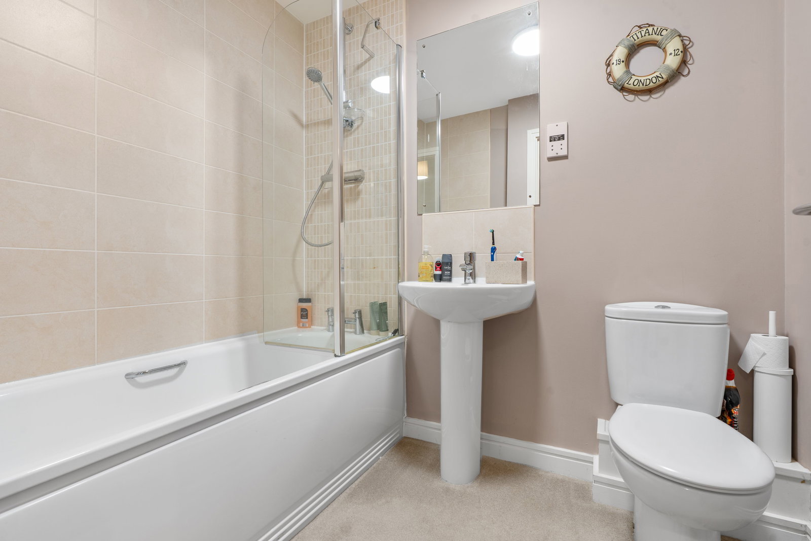 White suite comprising panelled bath with fully tiled surround, thermostatic shower over bath and glazed screen, wash hand basin with tiled splashback, low level w.c..