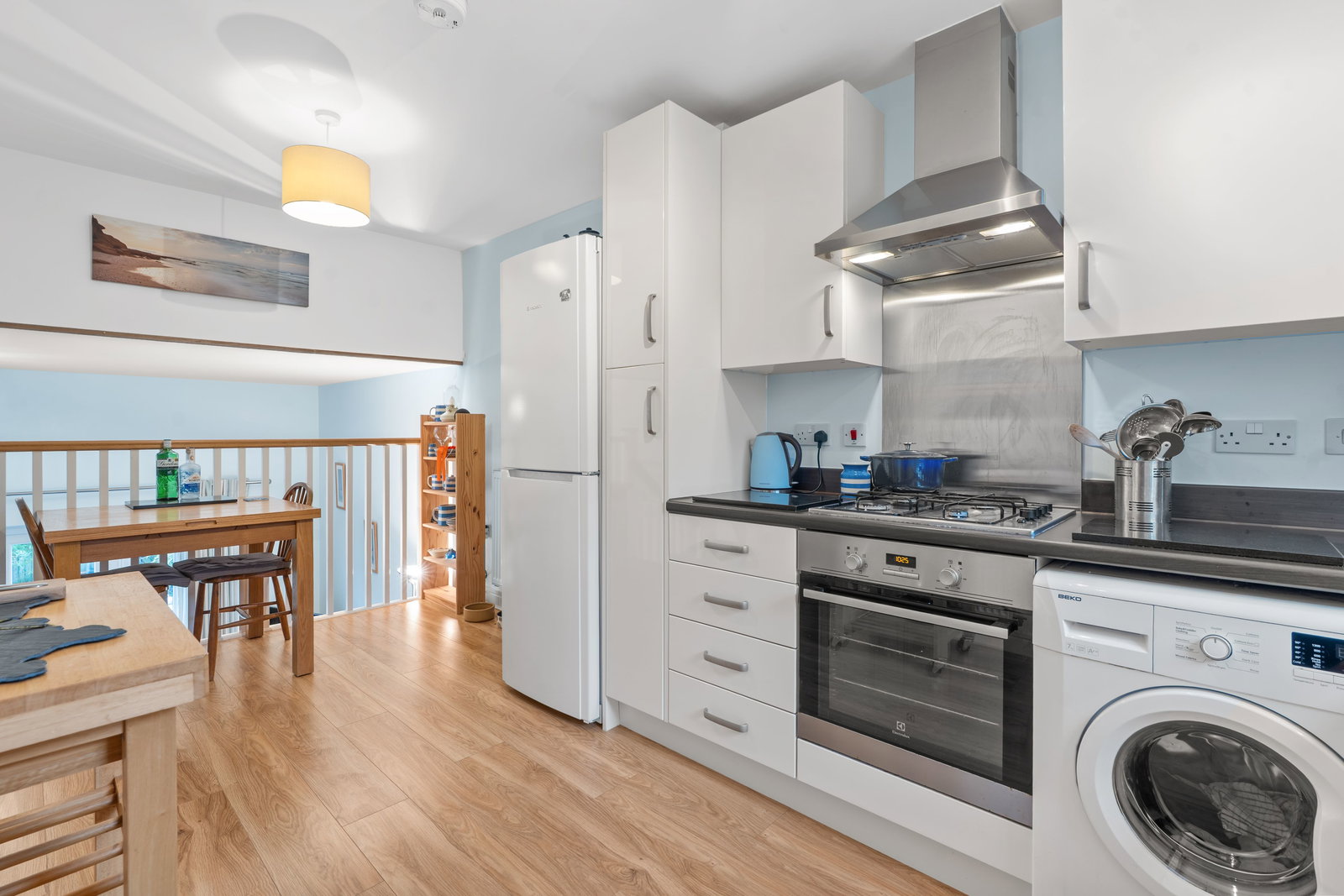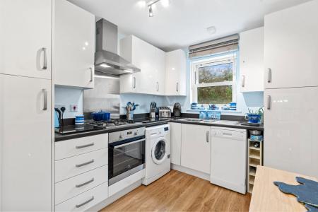 A pleasant modern fitted kitchen comprising single drainer one and a half bowl stainless steel sink with mixer tap over, good range of built in base and wall cupboards including drawers, roll edge worktops with matching splashbacks, built in Electrolux oven, 4 ring gas hob, stainless steel splashback and extractor hood, space and plumbing for washing machine and slimline dishwasher, cupboard housing Baxi gas fired central heating hot water boiler, double glazed window to front, 2 radiators, balustrade with steps down to the