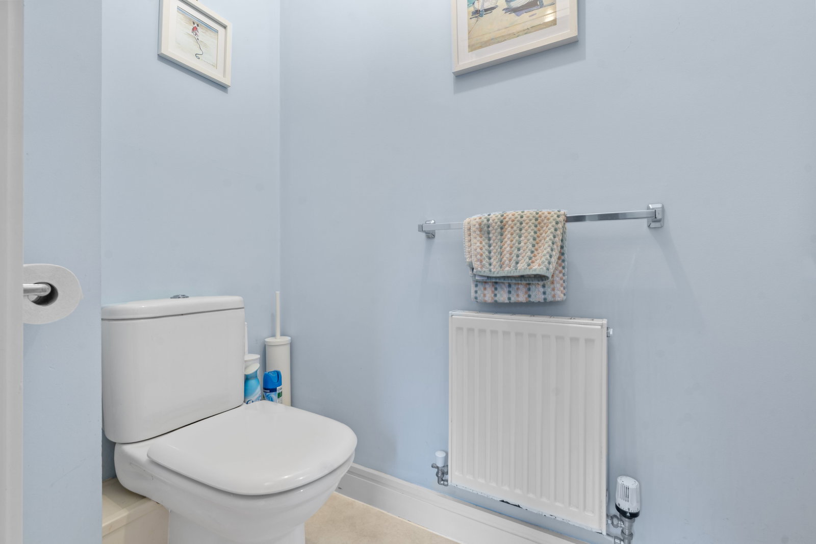 Low level w.c. Wash hand basin with tiled splashback. Radiator.
