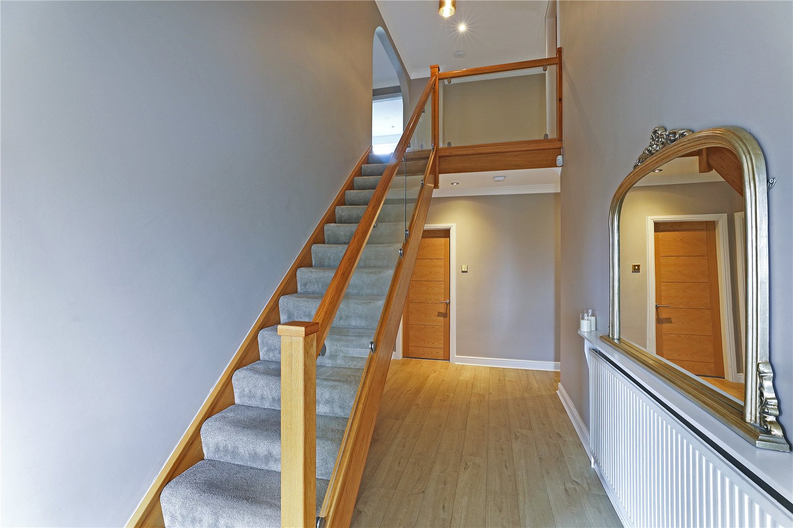 Reception Hallway With laminate wood flooring, feature open staircase with oak hand rail and glass balustrade, double glazed window and composite double glazed entrance door, single panel radiator.
