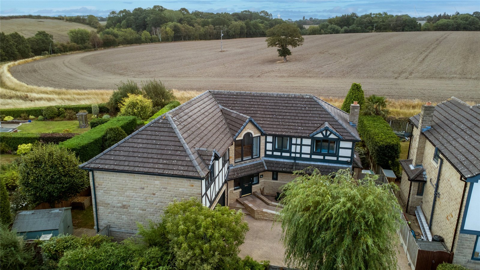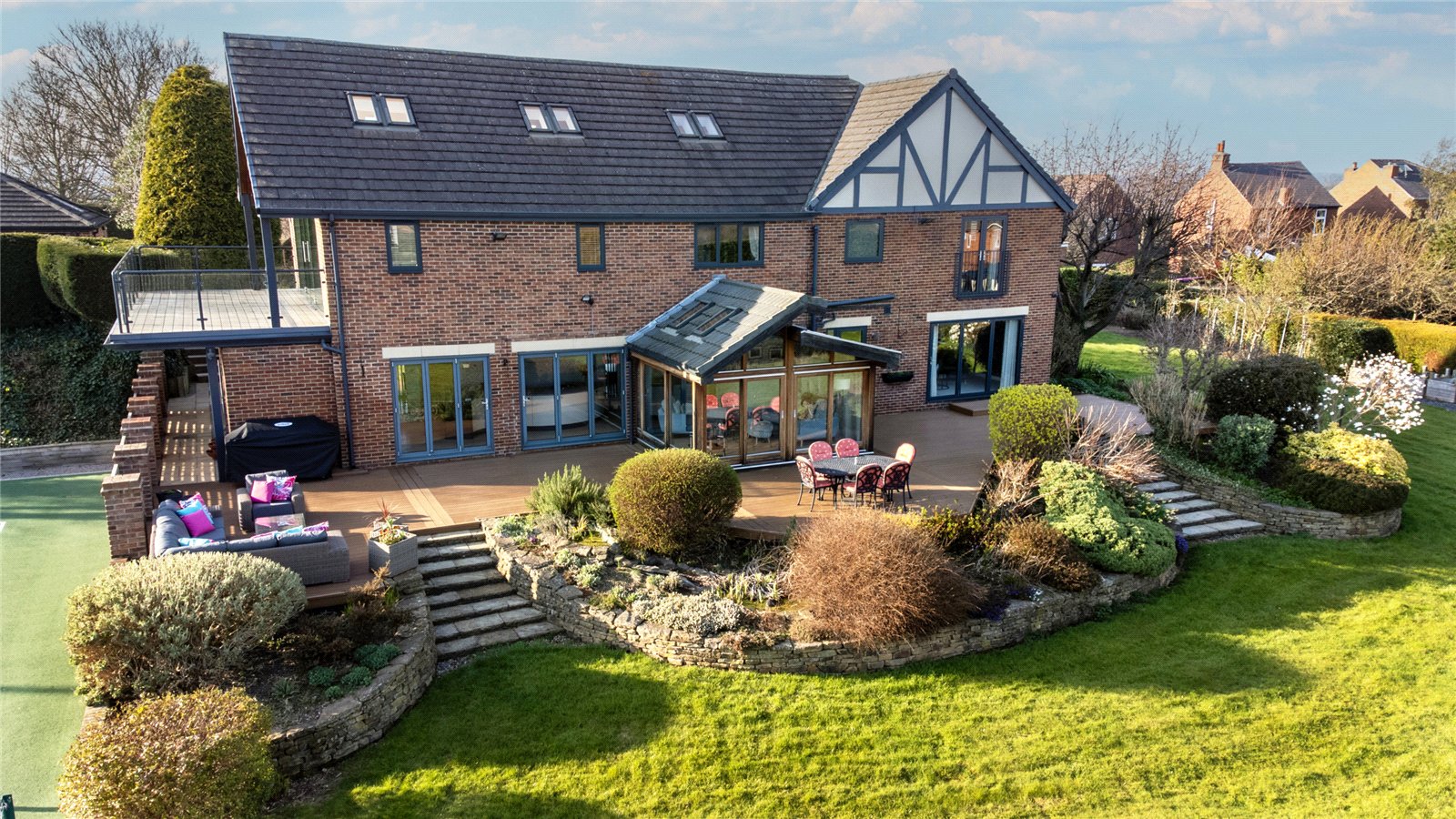 Stunning individual detached family home with large garden plot with all weather tennis court. Offering privacy with Det...