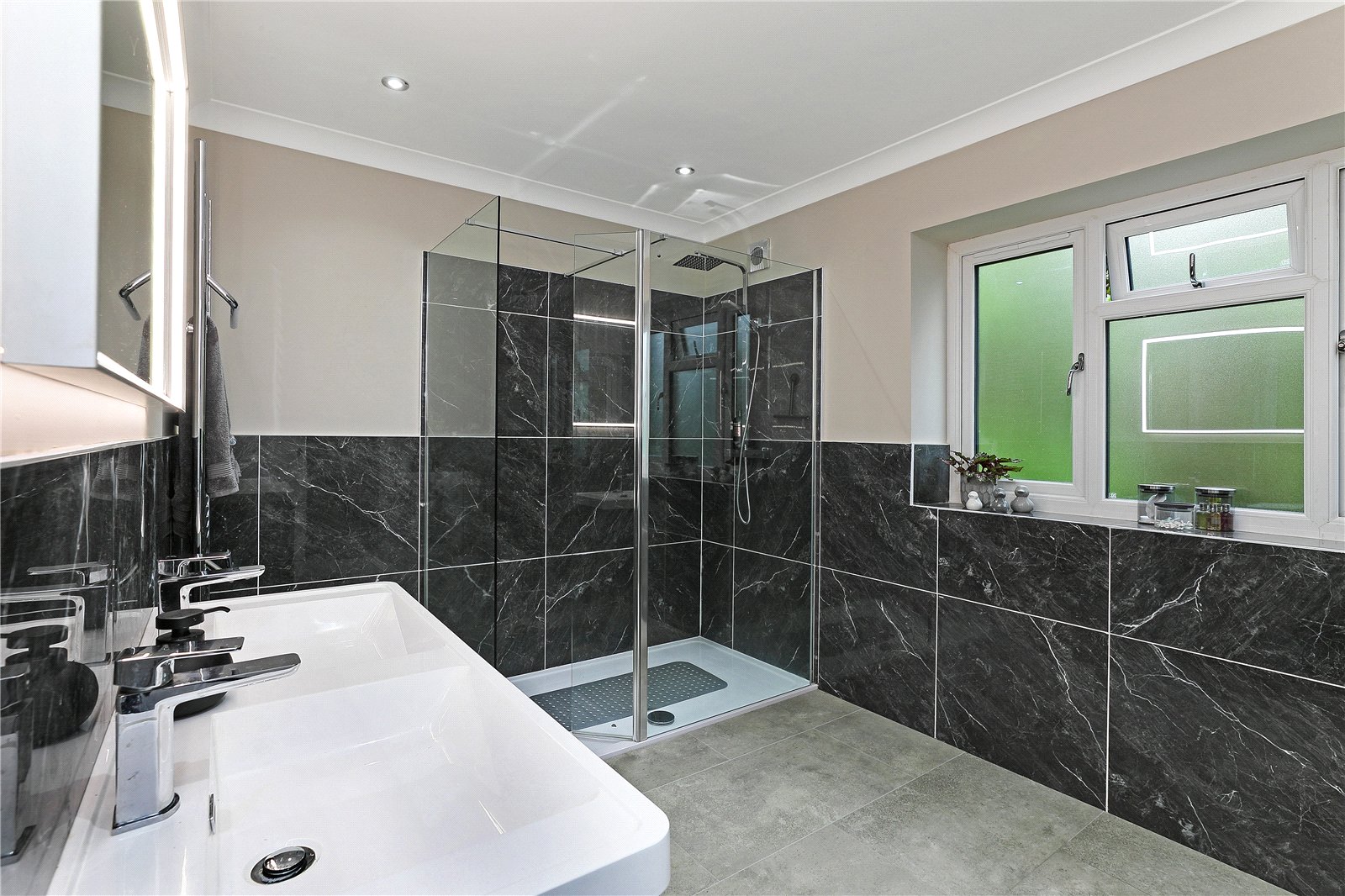 Ensuite Shower Room Recently fitted with contemporary style fittings with twin wash hand basins set in wall mounted vanity unit, low flush w/c, large walk-in shower with Raindance shower head, half tiling to the walls, chrome heated towel rail, double glazed window.