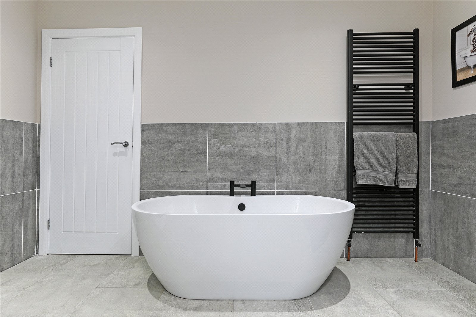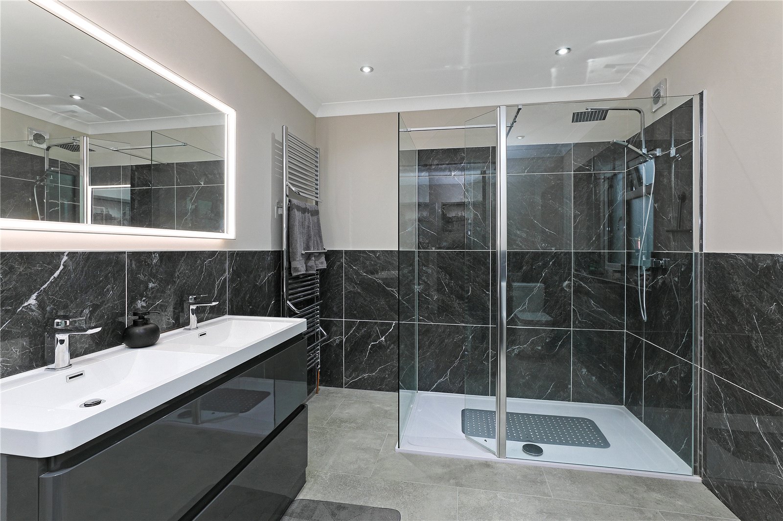 House Bathroom Furnished with contemporary white suite with feature matt black tap fitments with feature free standing tub bath, wash hand basin set in vanity unit, low flush w/c, large walk-in shower cubicle with Raindance shower head and attachment, feature vanity mirror, downlighting to the ceiling, half tiled walls, double glazed window, heated towel rail.