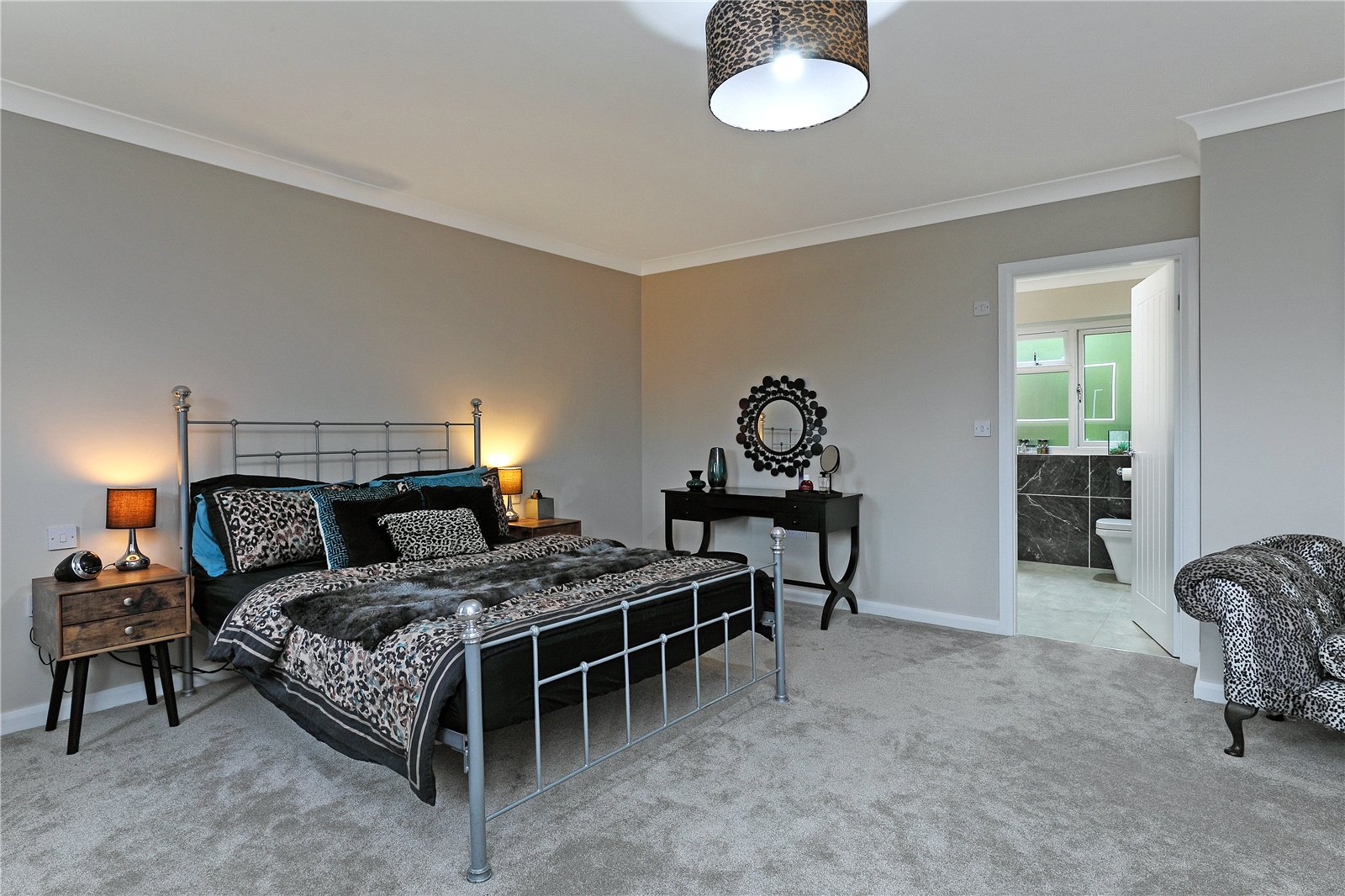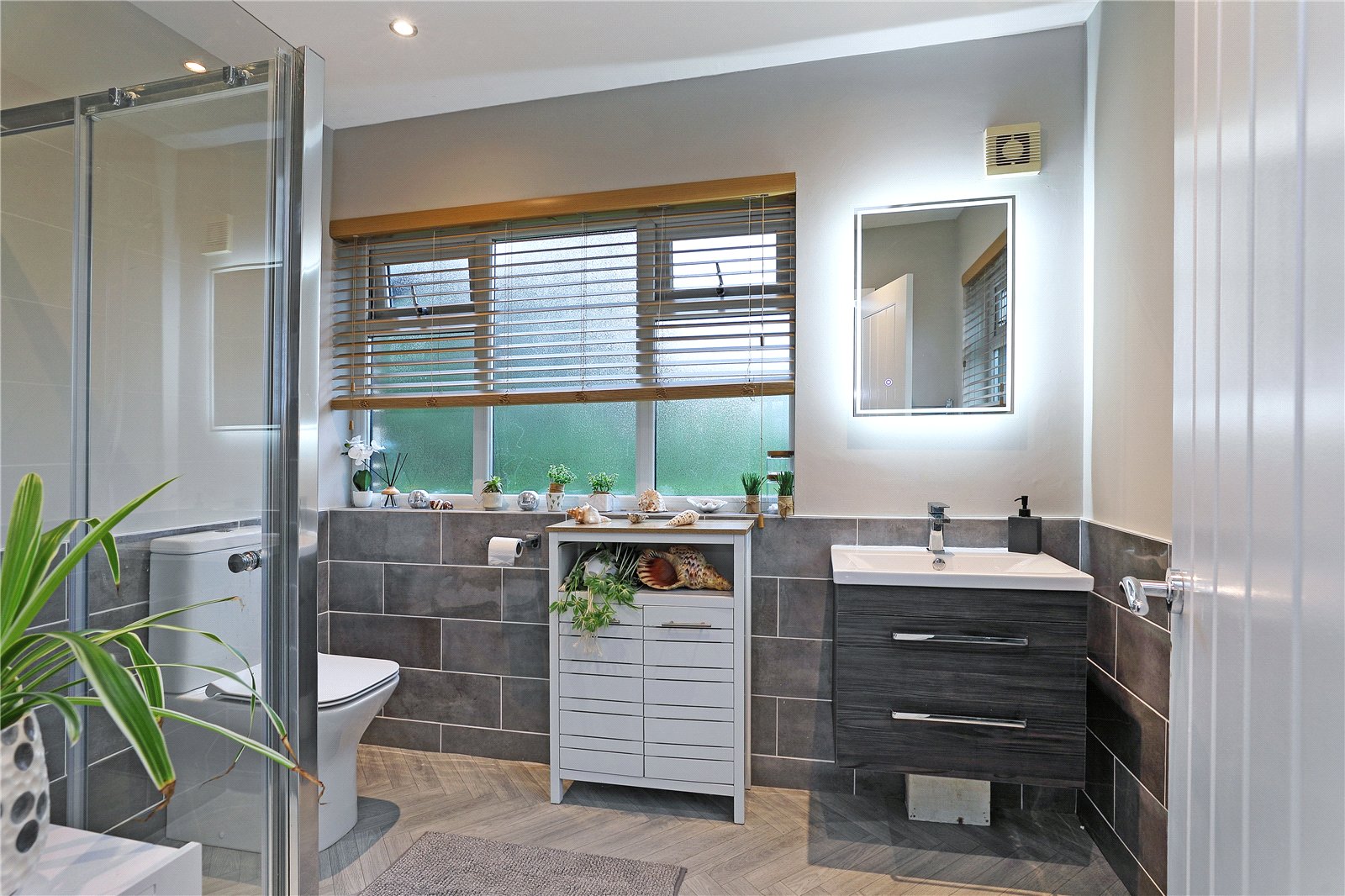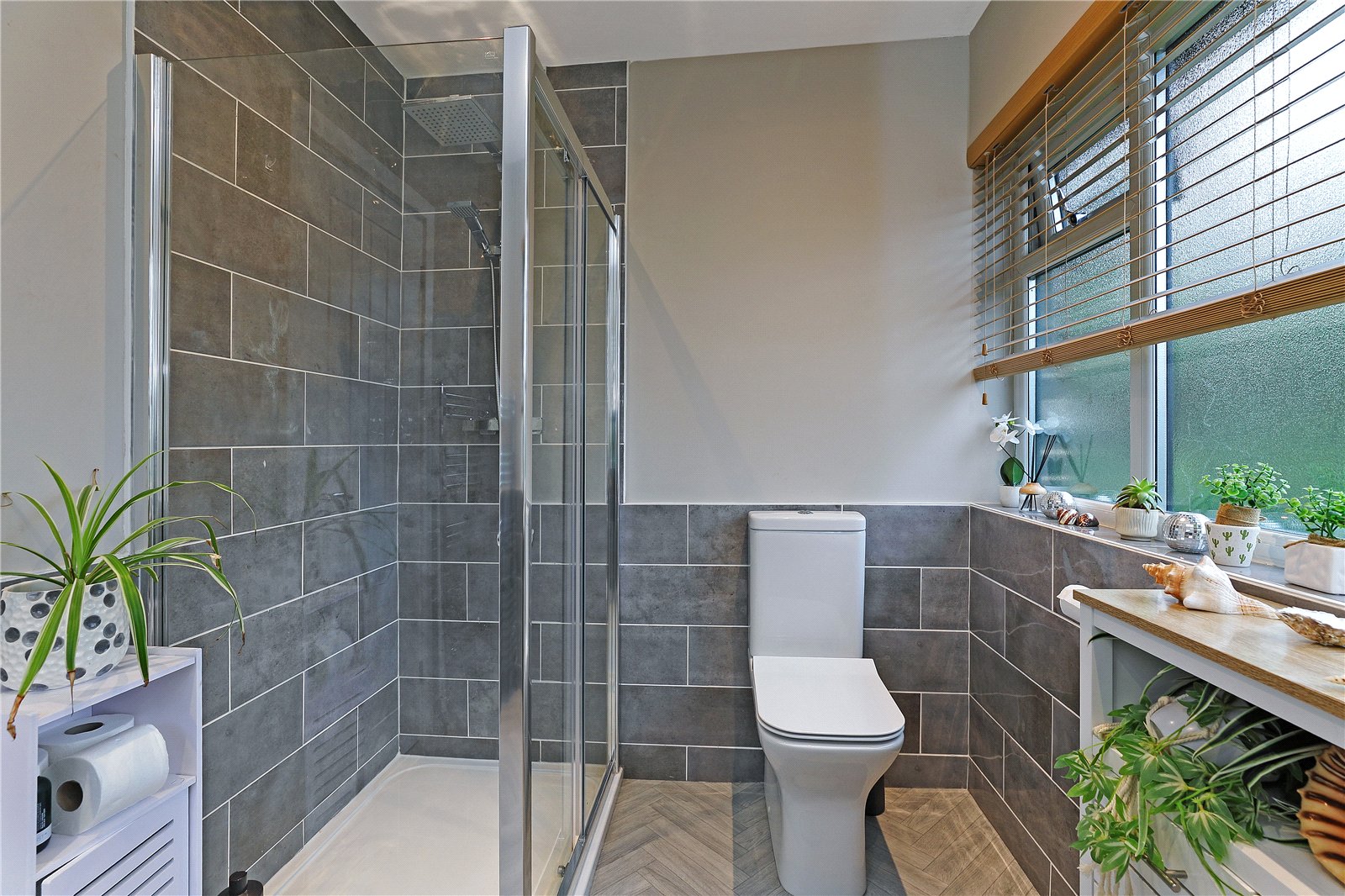 Ensuite Shower Room With wash hand basin set in vanity unit, low flush w/c, shower cubicle, half tiling, two double glazed windows, chrome heated towel rail.