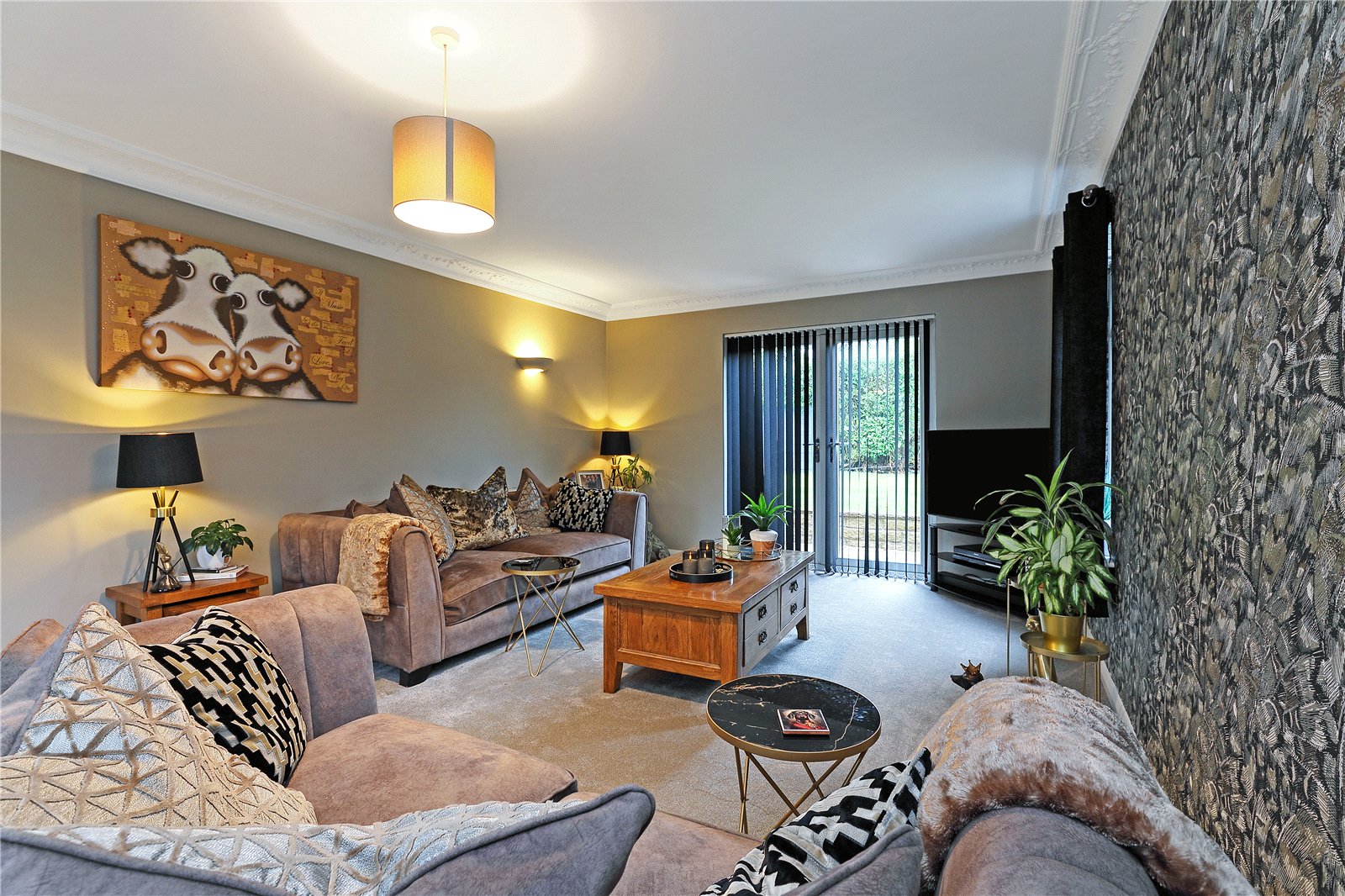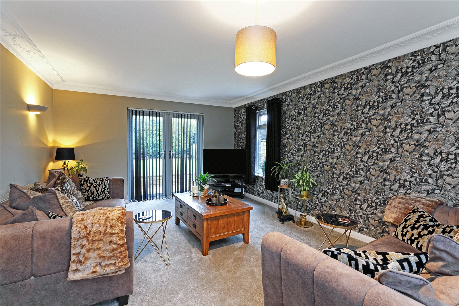 Through Living Room 26'3" x 11'1" (8m x 3.38m). With three double glazed windows to two sides, double glazed French doors leading onto the rear garden, coving to the ceiling, two wall light points, two central heating radiators.