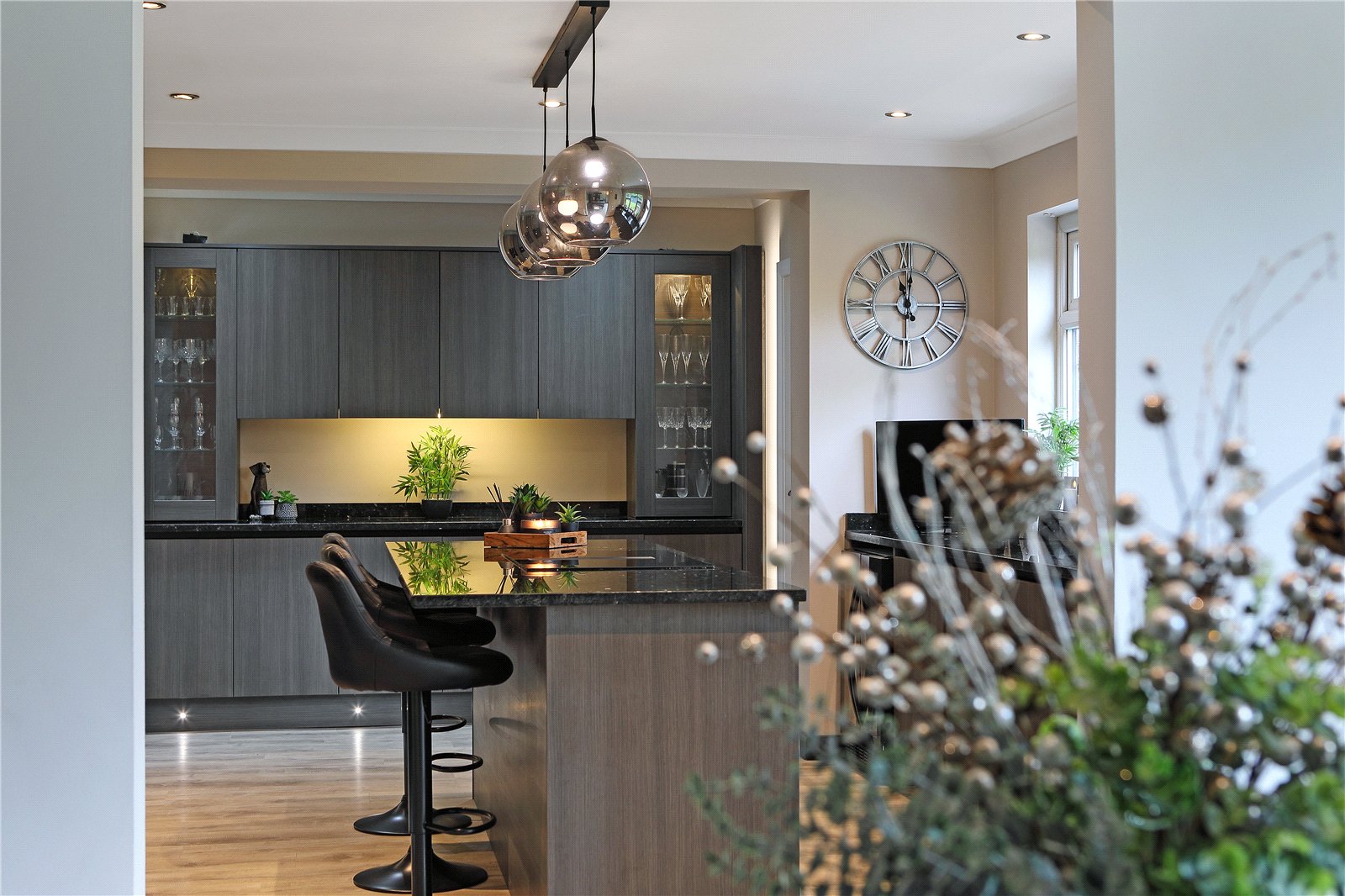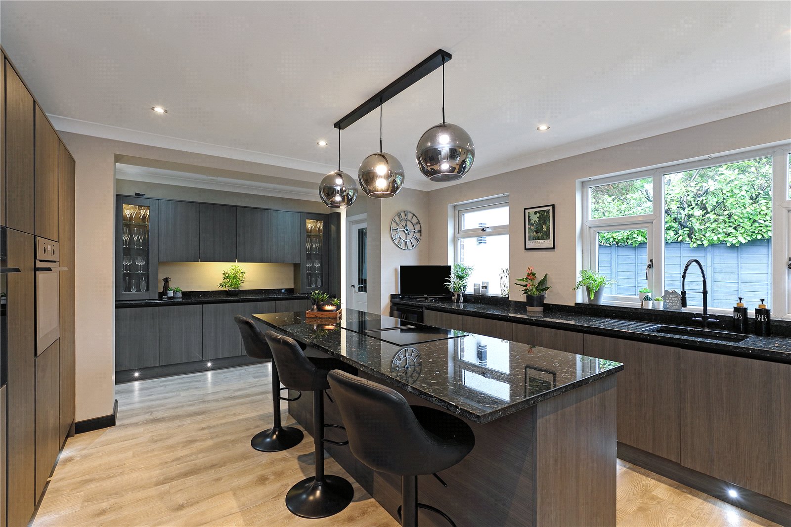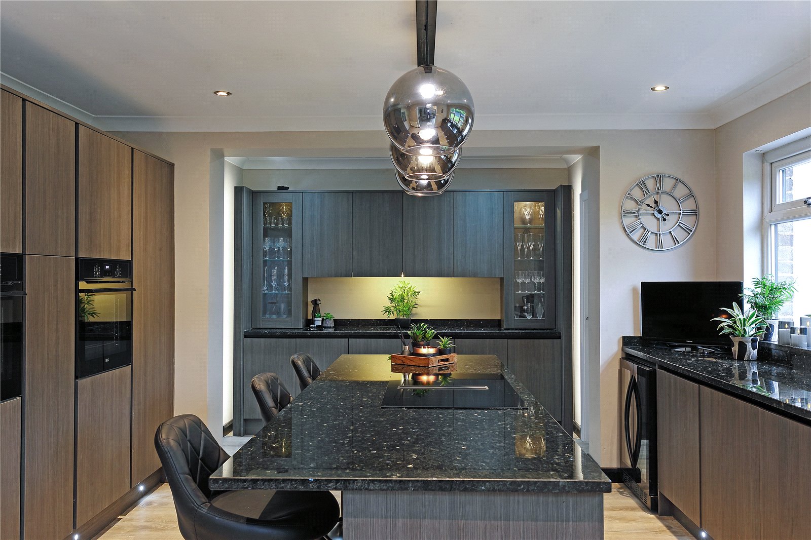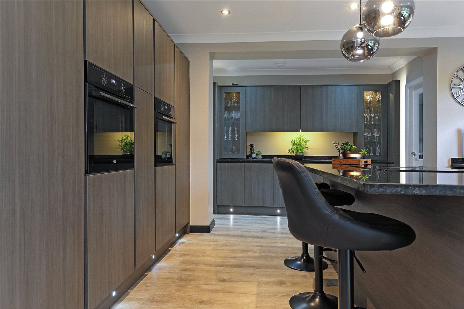 Breakfast Kitchen 19'8" x 13'11" (6m x 4.24m). Superbly appointed with a matching range of contemporary style fronted wall and base units, contrasting granite worktops and center island extending to breakfast bar with a comprehensive range of built in appliances including induction hob with downdraft extractor, two ovens, full height fridge and freezer, integrated bin, undermounted stainless steel sink with mixer tap unit, dishwasher, feature display unit with backlighting and walk-in pantry with sliding door and shelving, double glazed window, downlighting to the ceiling.