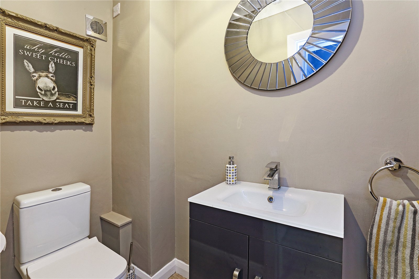Adjacent Cloakroom Having wash hand basin set in vanity unit, low flush w/c, central heating radiator.