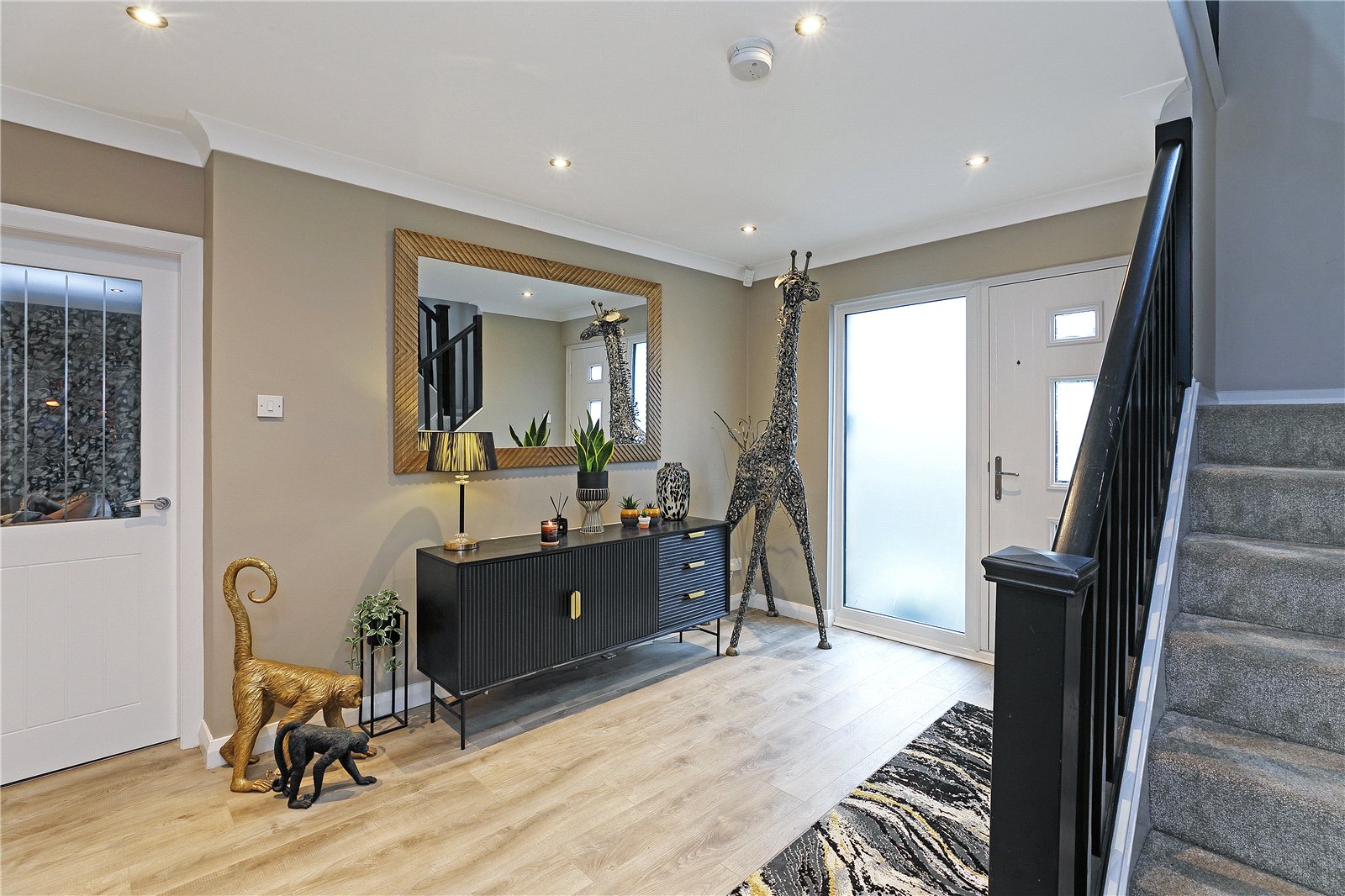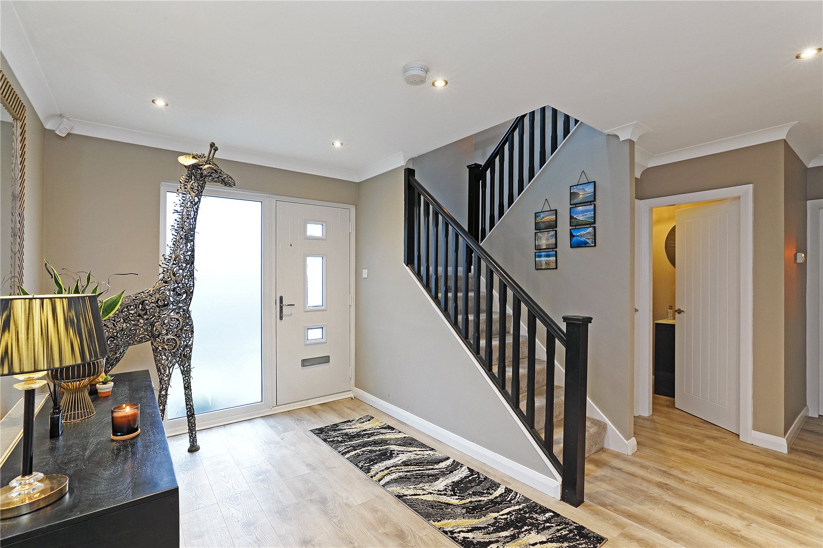 Impressive Reception Hallwy With composite double glazed entrance door, double glazed windows, downlighting to the ceiling, open staircase with storage under.