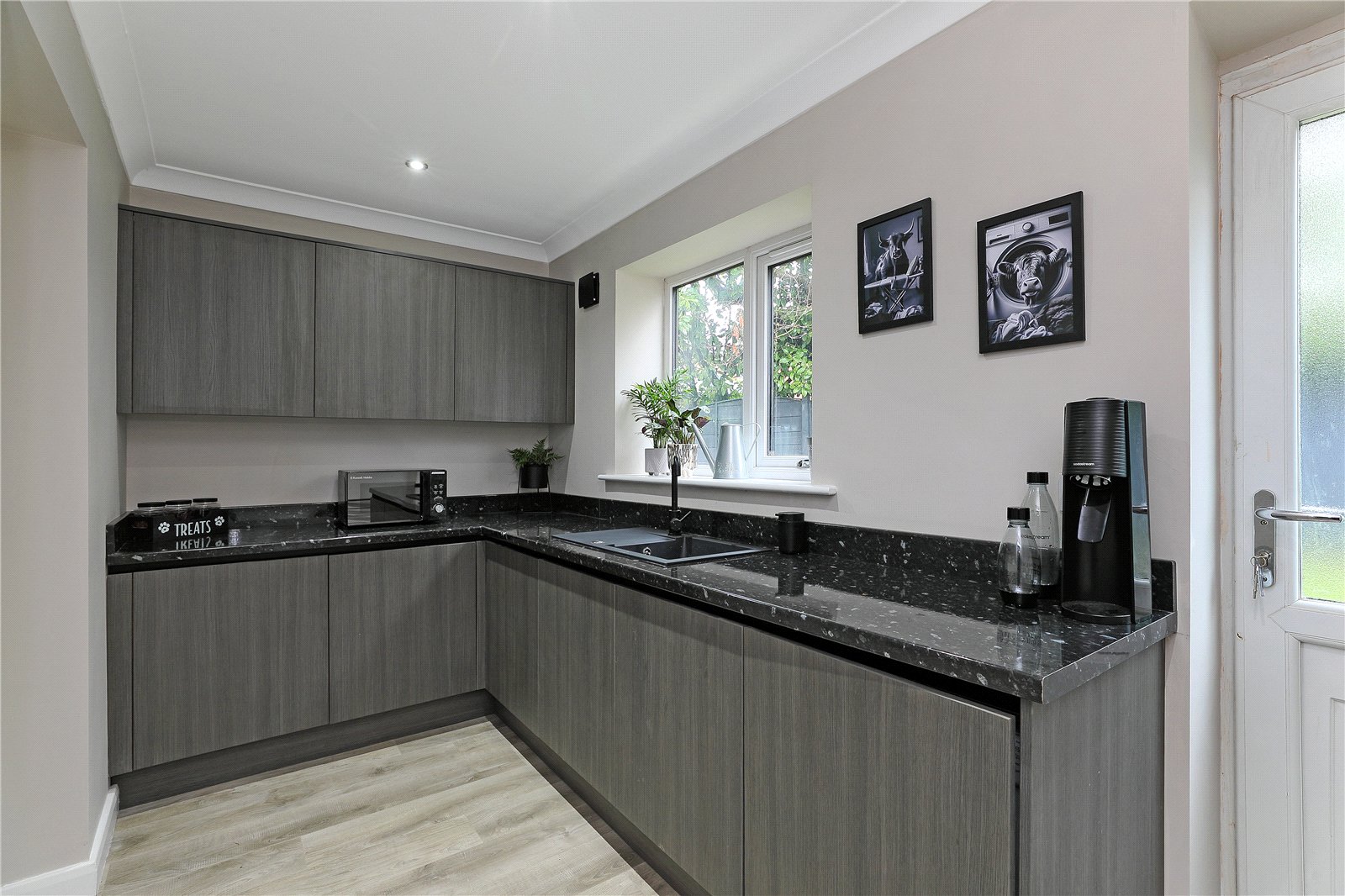 Adjacent Utility Room 13' x 6'2" (3.96m x 1.88m). Fitted with a matching range of wall and base units, contrasting high gloss worktops, colour co-ordinated sink unit, monobloc tap fitment, plumbing for automatic washing machine, double glazed window and rear entrance door, access door to garage.