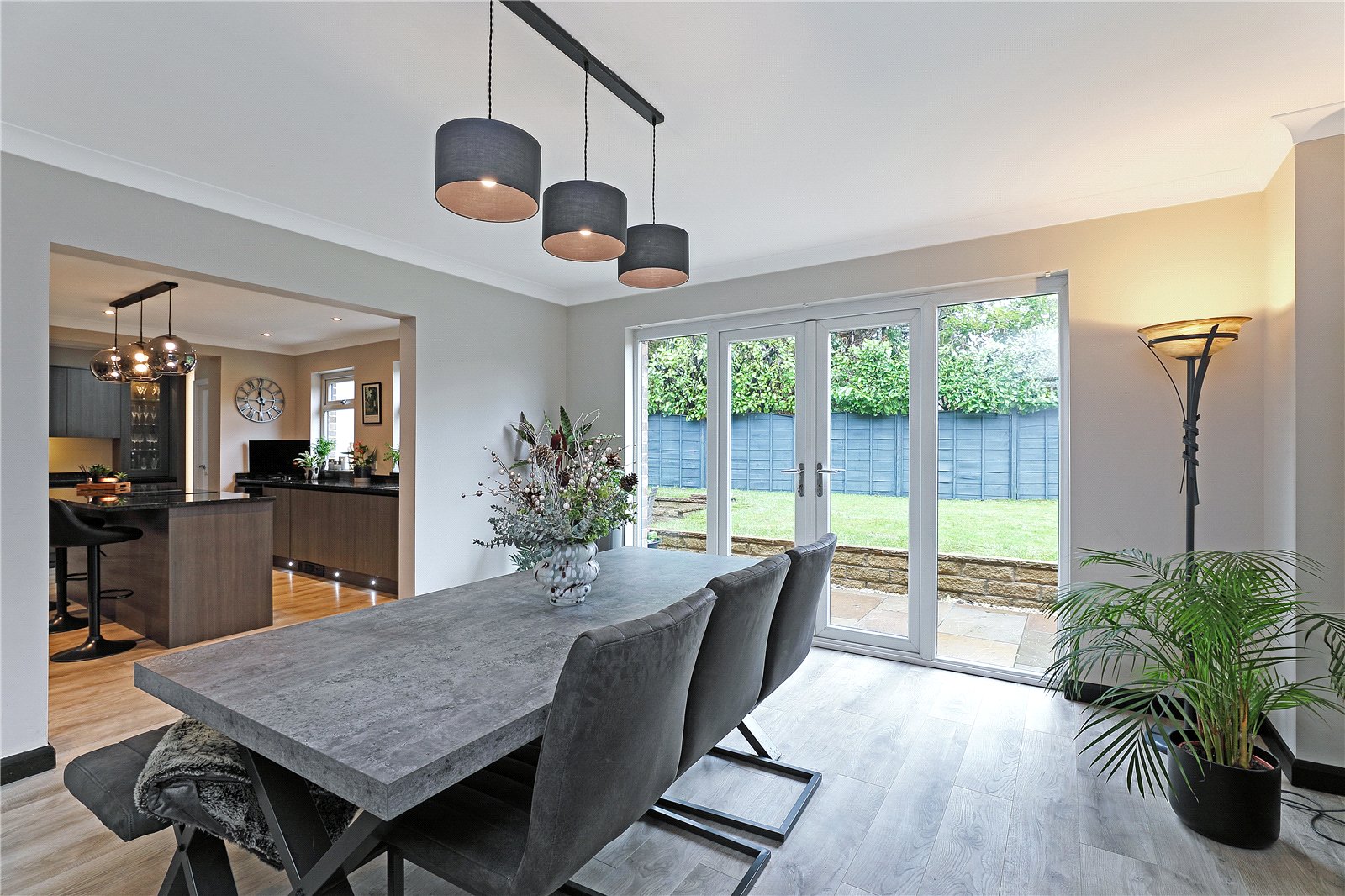 Formal Dining/Family Room 13'11" x 13'11" (4.24m x 4.24m). With two double glazed windows and French doors overlooking the rear garden, laminate wood flooring, downlighting to the ceiling, opening through to...