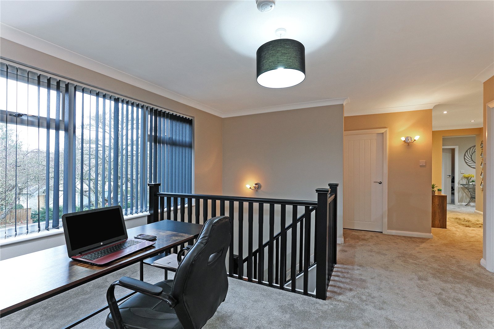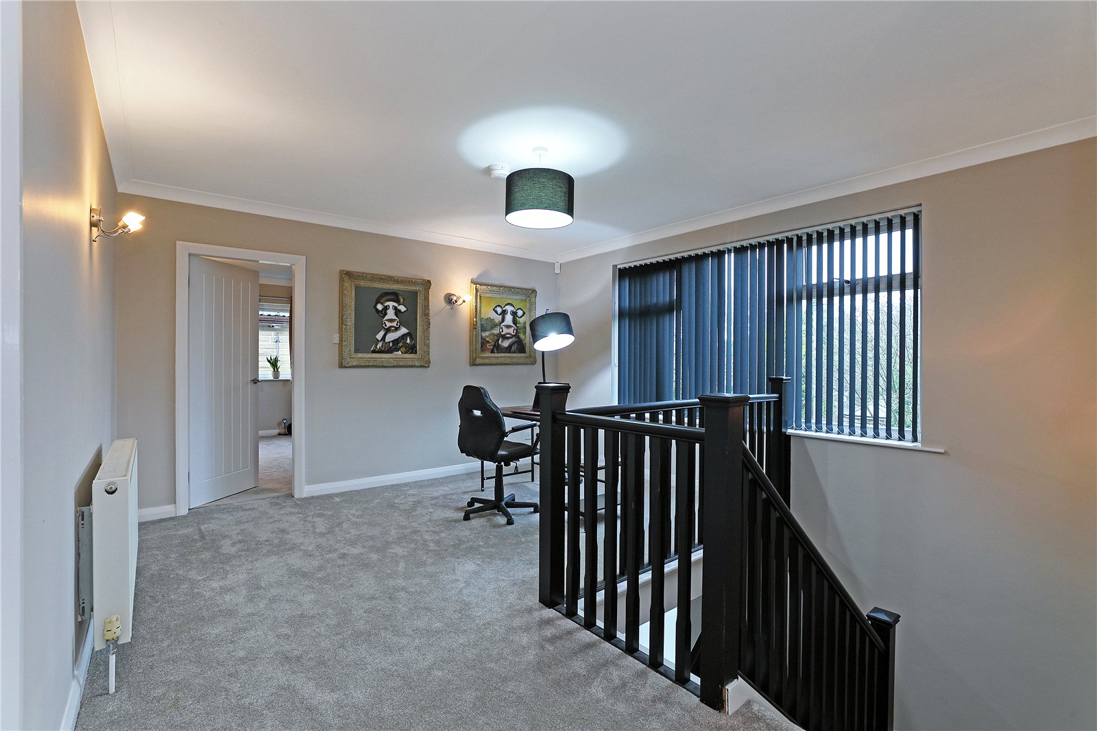 Spacious Landing Offering excellent home office/reading area with three wall light points, open staircase and double glazed window makes this a light airy room, built in storage containing central heating boiler.