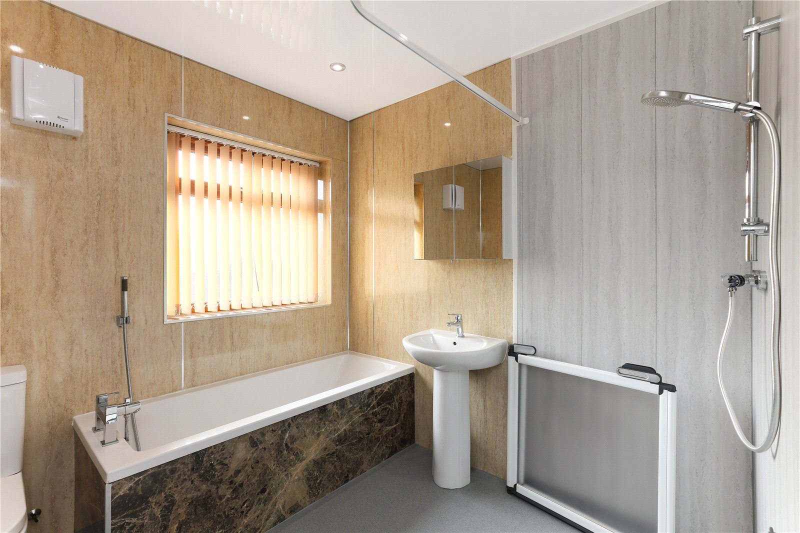 House Bathroom/Wet Room Furnished with modern white suite comprising wash hand basin, low flush w/c, panelled bath, walk-in shower, chrome heated towel rail, wet walling, double glazed window.
