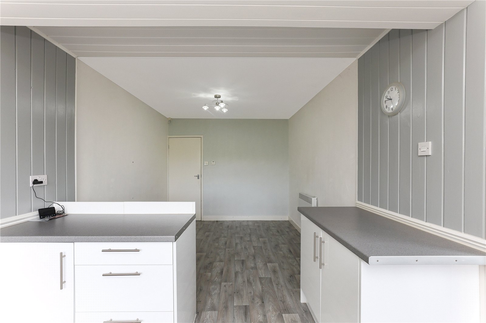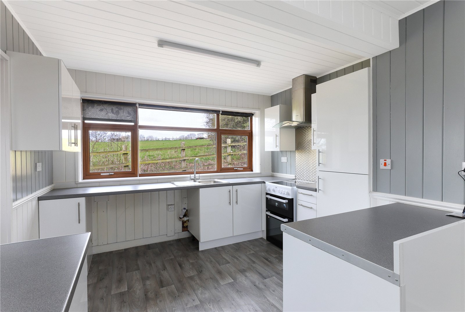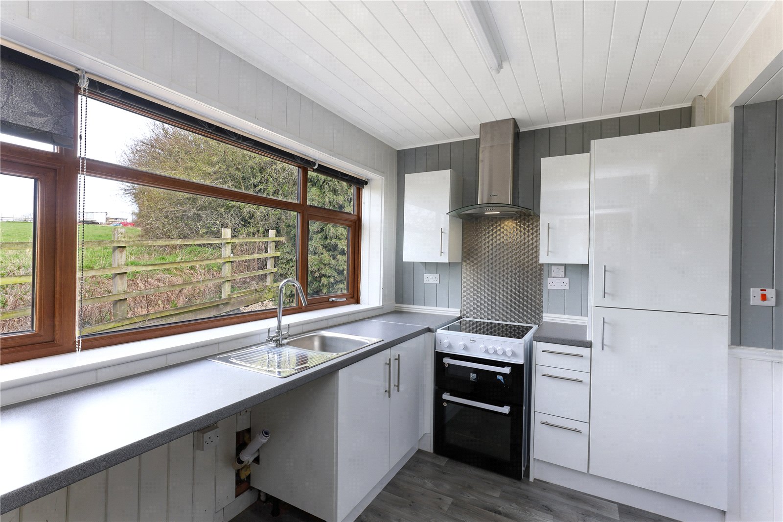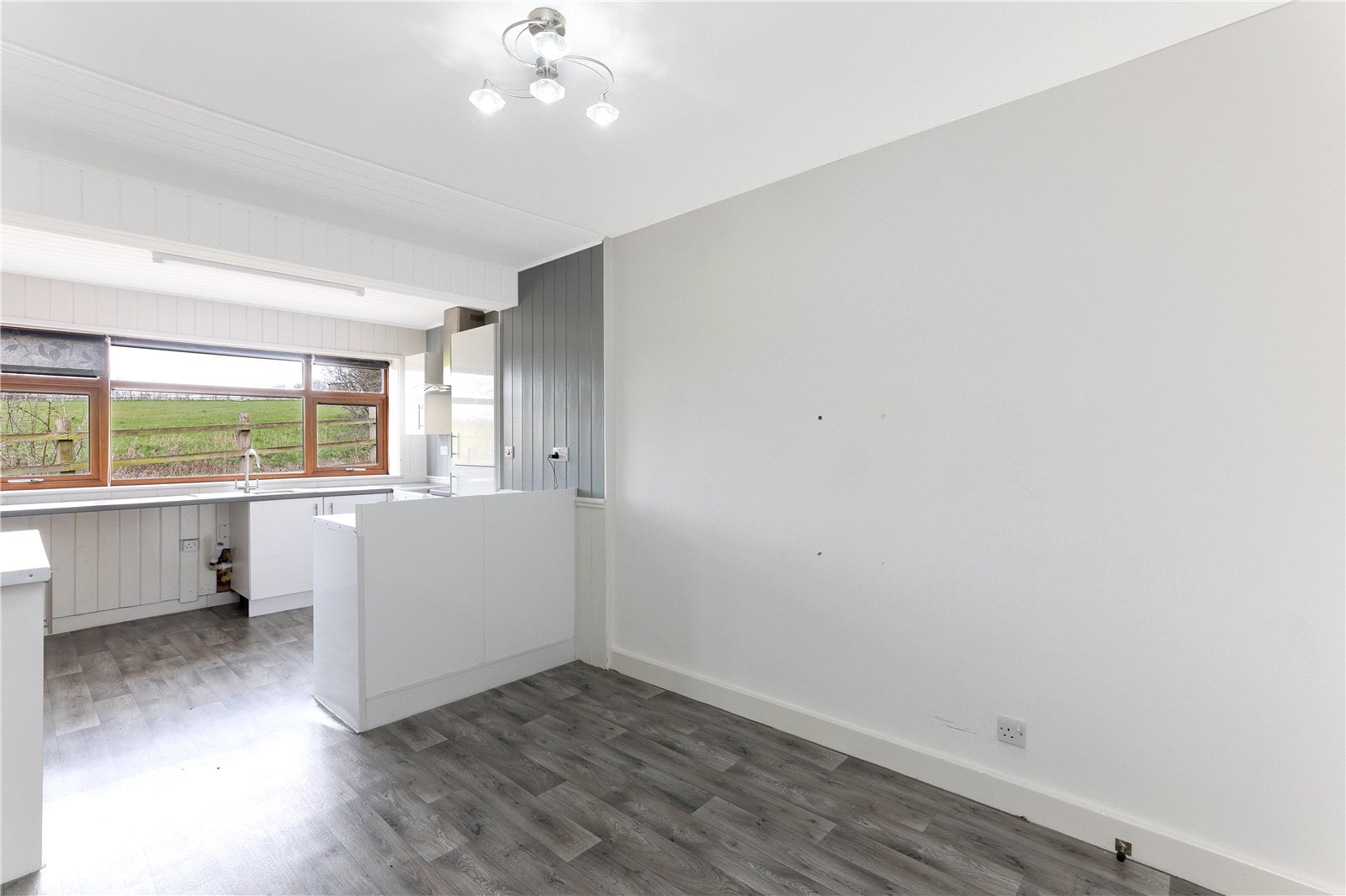 Extended Kitchen/Diner 20'11" (6.37m) x 9'5" (2.87m) opening to 11' (3.36m). An excellent entertaining space fitted with a range of white gloss fronted wall and base units, contrasting worktop areas, stainless steel sink unit, single drainer, plumbing for automatic washing machine, space for electric cooker with extractor hood over, double glazed window making the most of the views, double glazed rear entrance door, electric heater.