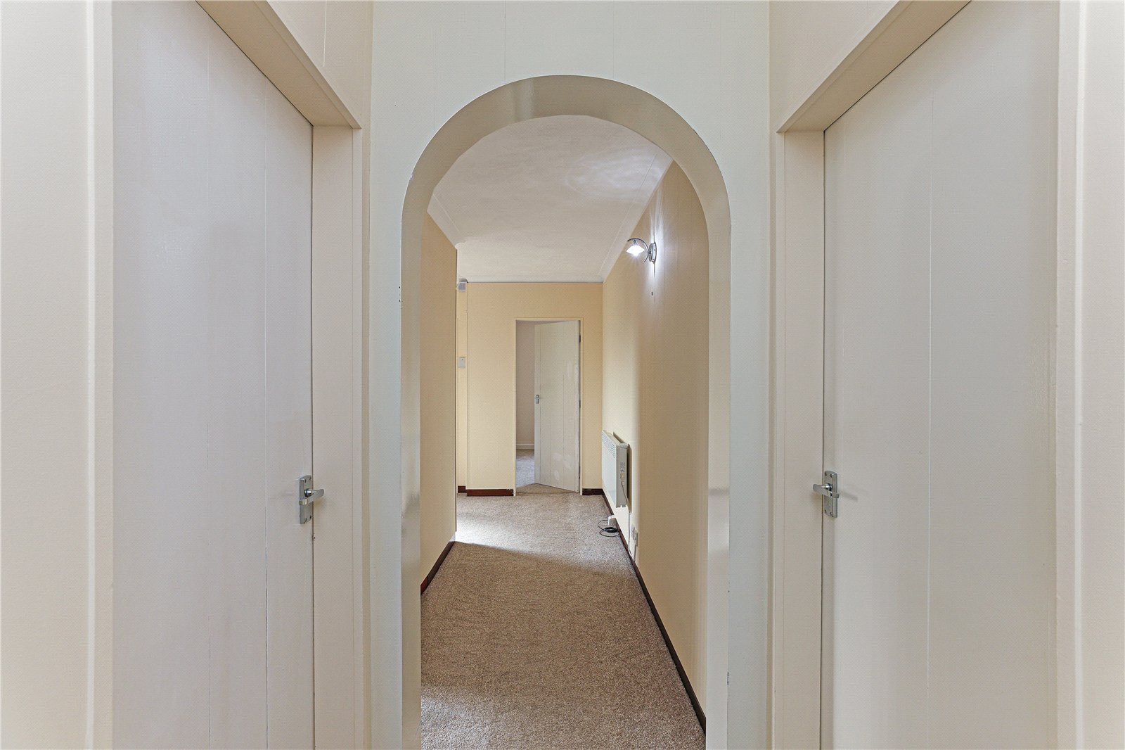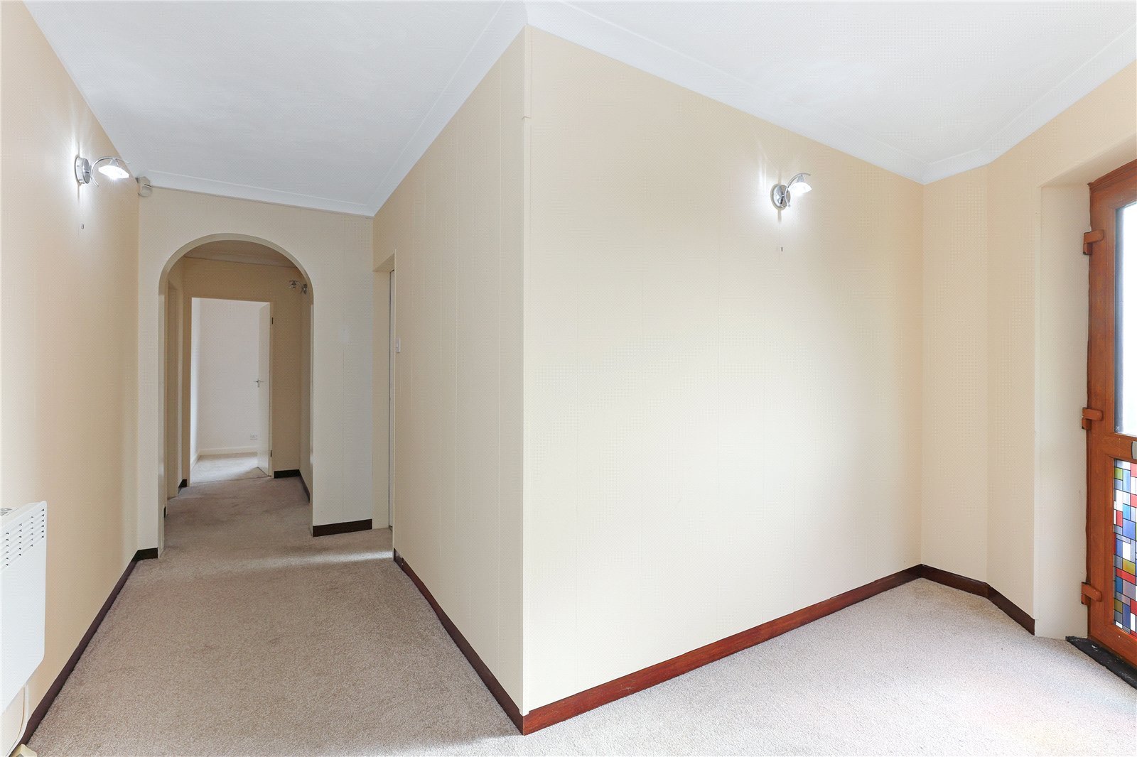 Reception Hallway With double glazed entrance door, built in storage cupboard with double glazed window, two wall light points, electric heater.