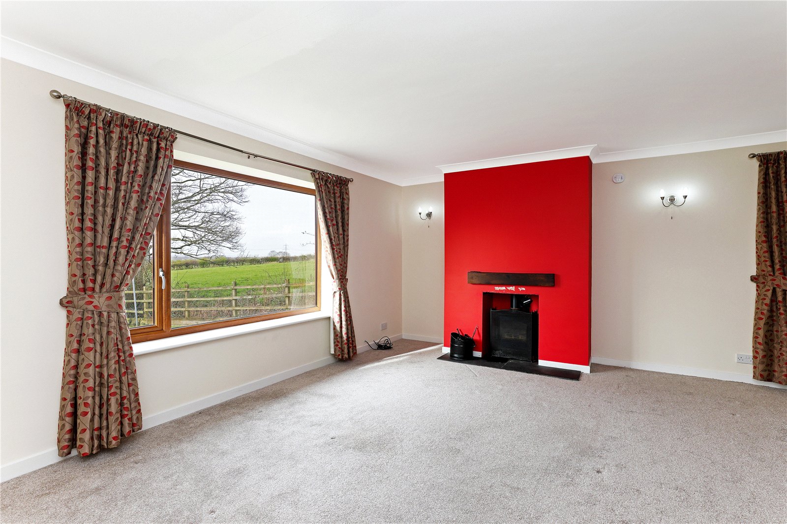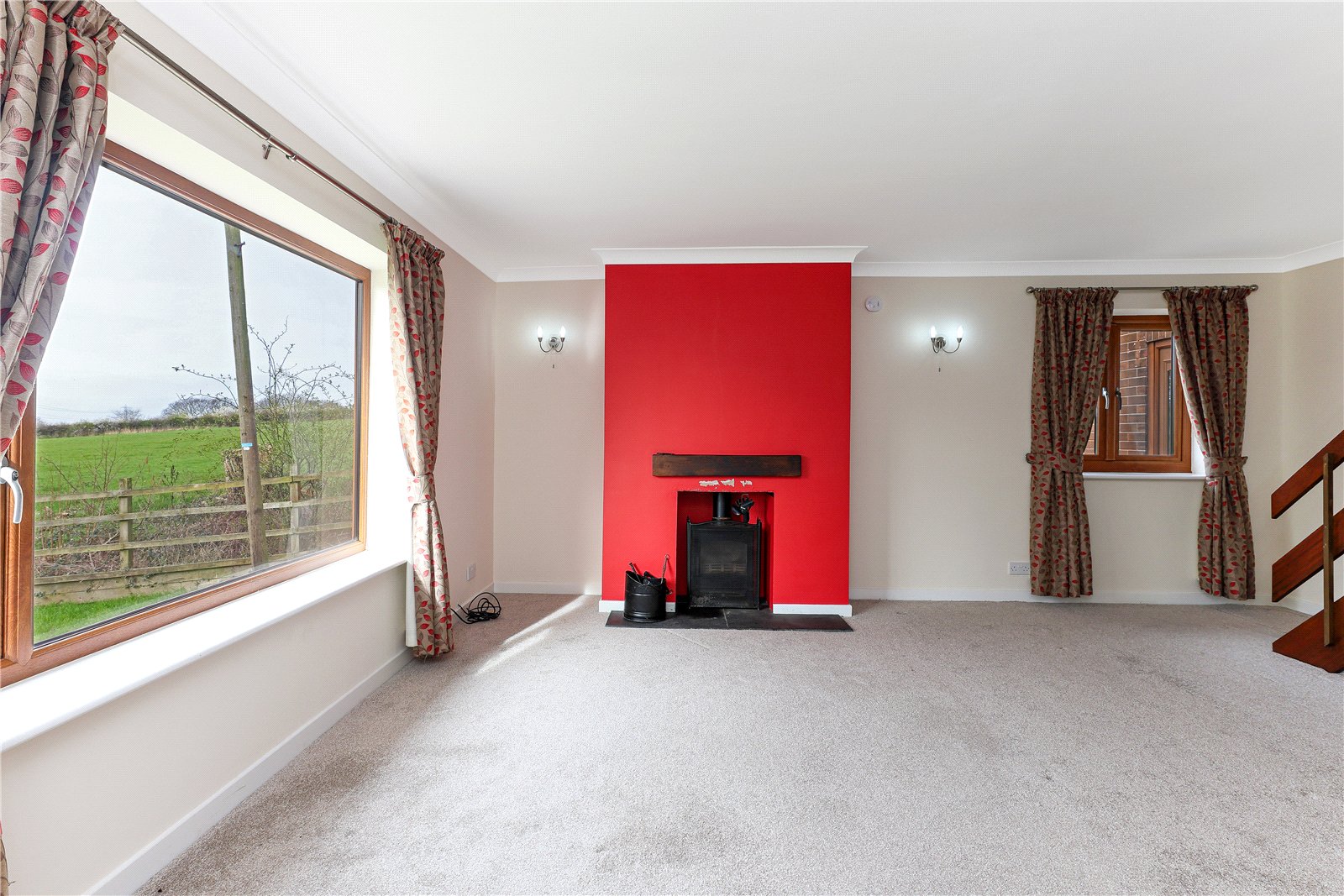 Living Room 18'1" x 19' max (5.5m x 5.8m max). Having feature log burner set on slate hearth, dual aspect double glazed windows makes the most of the views, electric radiator, feature open staircase, five wall light points.