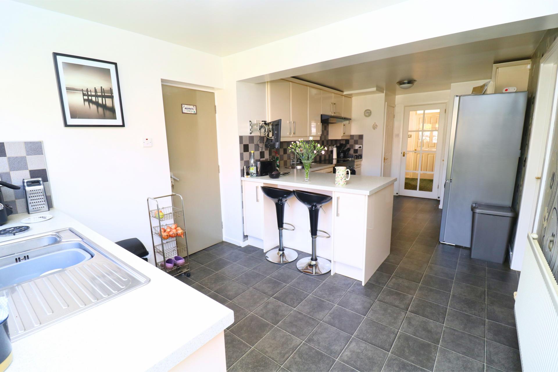 Having a range of wall and base units with roll top work surfaces, space for range master, extractor, round sink with mixer tap over, one and a half sink with drainer, plumbing for washing machine and dishwasher, space for fridge/freezer, part tiled walls, two storage cupboards, breakfast bar with space for two stools, three ceiling light points, double glazed window to rear, door out to garden, door to garage and radiator.