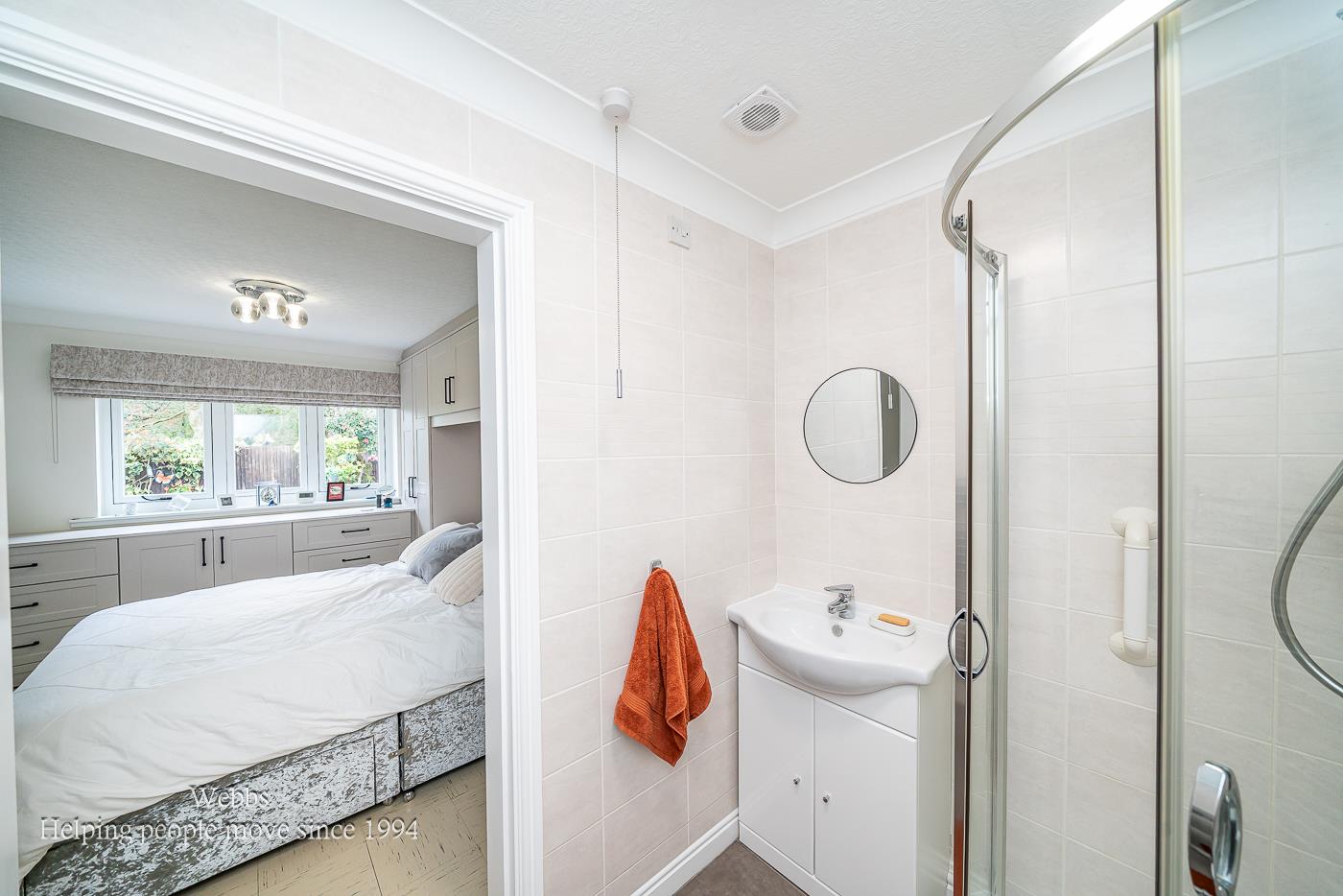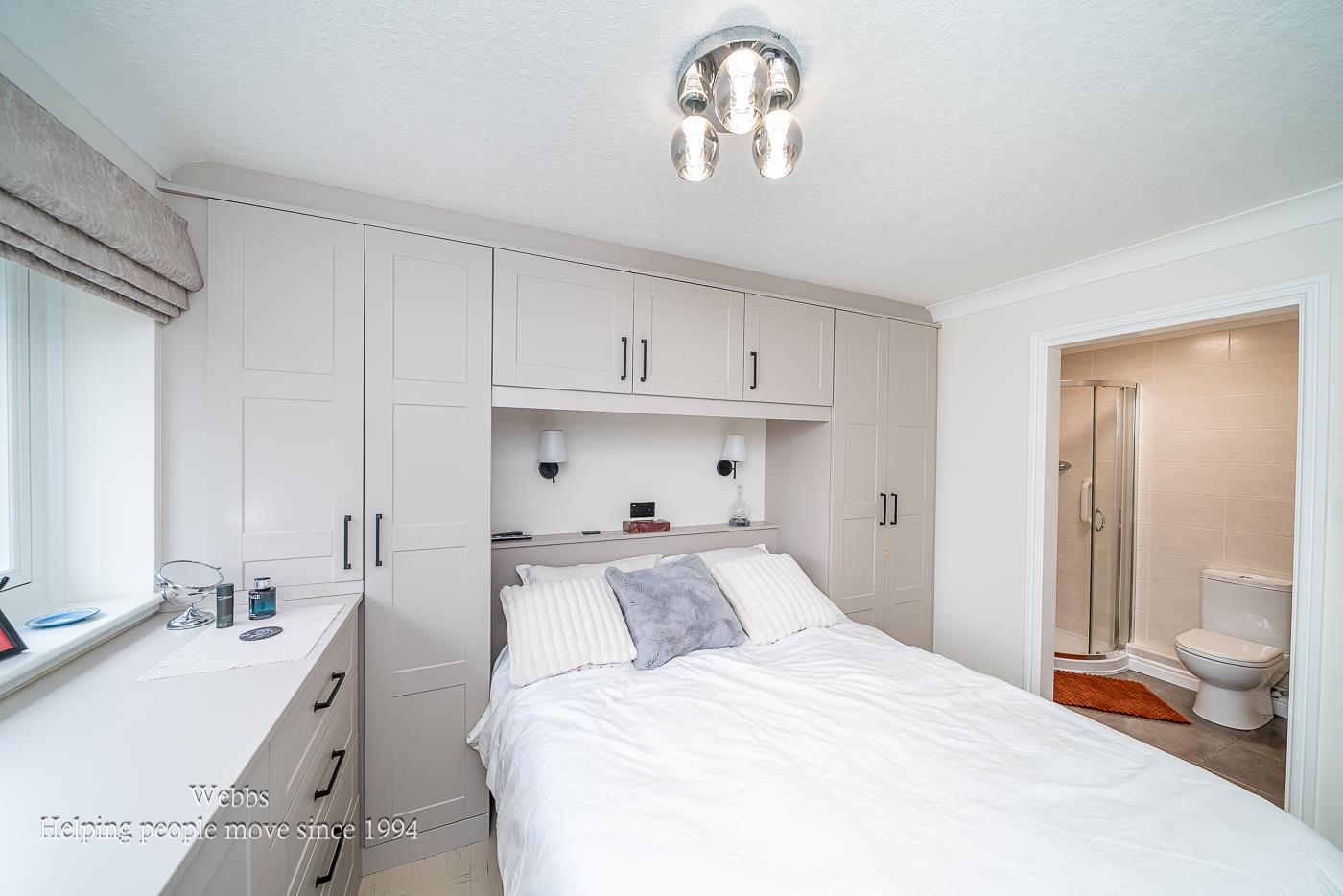 This bungalow offers two generously sized bedrooms, ideal for family or guests, along with a stunning refitted shower room adorned with elegant copper accents. The master bedroom is a private retreat, featuring fitted furniture and an en-suite shower room for added convenience.
