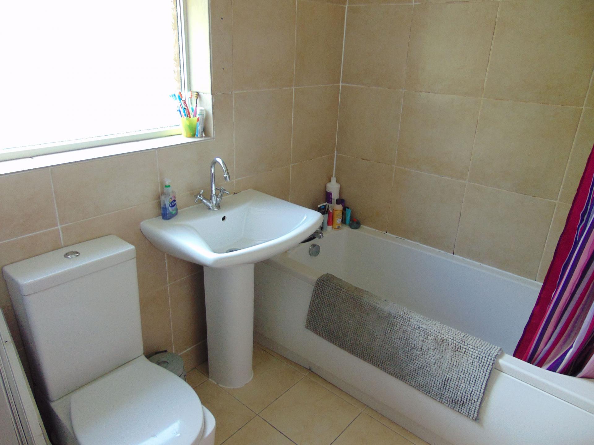 PVCu double glazed frosted window to rear elevation, panelled bath with electric shower over, pedestall wash hand basin, WC, tiled walls and floor, ceiling light point, chrome heated towell rail and airing cupboard off housing the "Ferroli" combination central heating boiler.