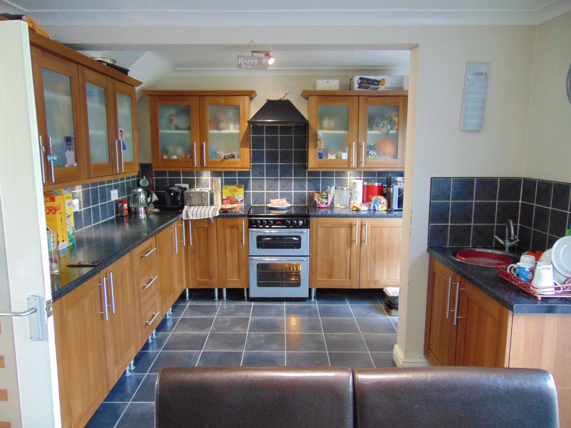 PVCu double glazed door and additional sliding patio door leading to the rear elevation, range of modern fitted wall, base units and drawers, working surfaces with inset stainless steel sink with mixer tap over, tiled surrounds, space and plumbing for automatic washing machine, space for tumble drier and central heating radiator.