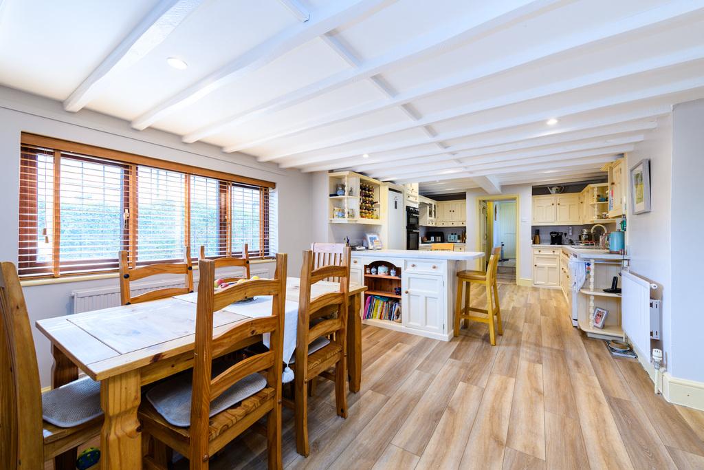 Entering beneath the covered canopy, the home welcomes you either through the practical utility entrance or the more formal hall. From the outset, the property exudes charm and character, with exposed wooden beams and cottage-style ceilings running throughout, reflecting its history as a former farmhouse and barn. Entering via the utility, you’ll find a practical space with storage for coats and shoes, plumbing for laundry appliances and a useful larder cupboard. From here, a cloakroom with built-in storage is conveniently positioned before leading into the heart of the home the inviting kitchen/breakfast room. This country-style kitchen is beautifully appointed with a range of wall, base and drawer units, complete with an integrated oven, induction hob and space for undercounter appliances. Dual windows flood the room with natural light, and the layout is designed for modern living while retaining its rustic feel. It provides the perfect setting for entertaining, cooking or enjoying family meals together. A door opens into the formal dining room a versatile, well-proportioned space full of charm and character, ideal for family gatherings or entertaining guests. From both the dining room and kitchen, you step into the sitting room. Here, a magnificent inglenook fireplace fitted with a multi-fuel burner and original bread oven takes centre stage, enhanced by the home’s rich character. French doors open directly onto the garden, creating a seamless connection between indoor comfort and outdoor living. This is a space full of atmosphere, the perfect spot for cosy evenings by the fire. The ground floor also includes a cosy snug/library, providing the ideal spot for reading or quiet relaxation, along with a separate study, perfectly suited for home working or hobbies. These additional reception rooms offer excellent flexibility, with the potential to adapt the layout for multi generational living or to meet the changing needs of family life.