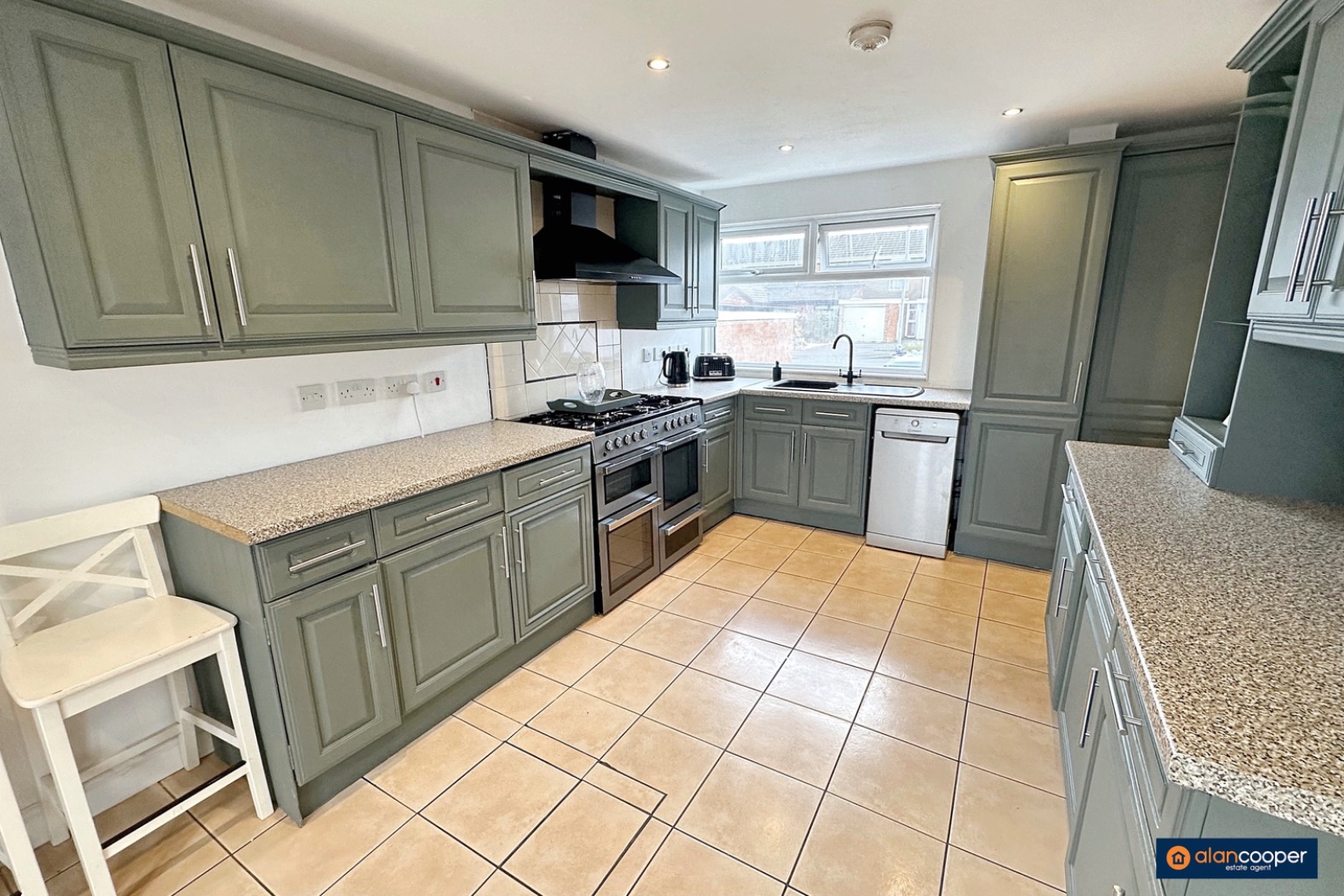 The spacious, wide UPVC conservatory is a true highlight, offering an abundance of natural light with its picture windows and glazed double doors that open directly onto the rear garden. This versatile space can be enjoyed year-round, whether for dining, relaxing, or as a play area. The breakfast kitchen is well appointed, featuring a Flavel range-style cooker and an integrated fridge. A front window provides natural light, and further glazed double doors lead into the conservatory, enhancing the open plan feel and making it perfect for entertaining.