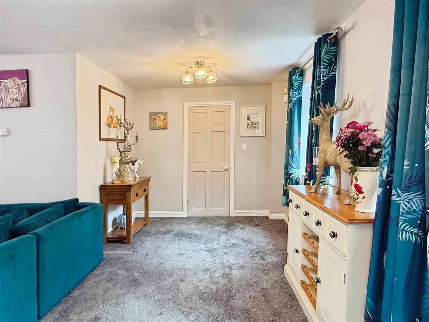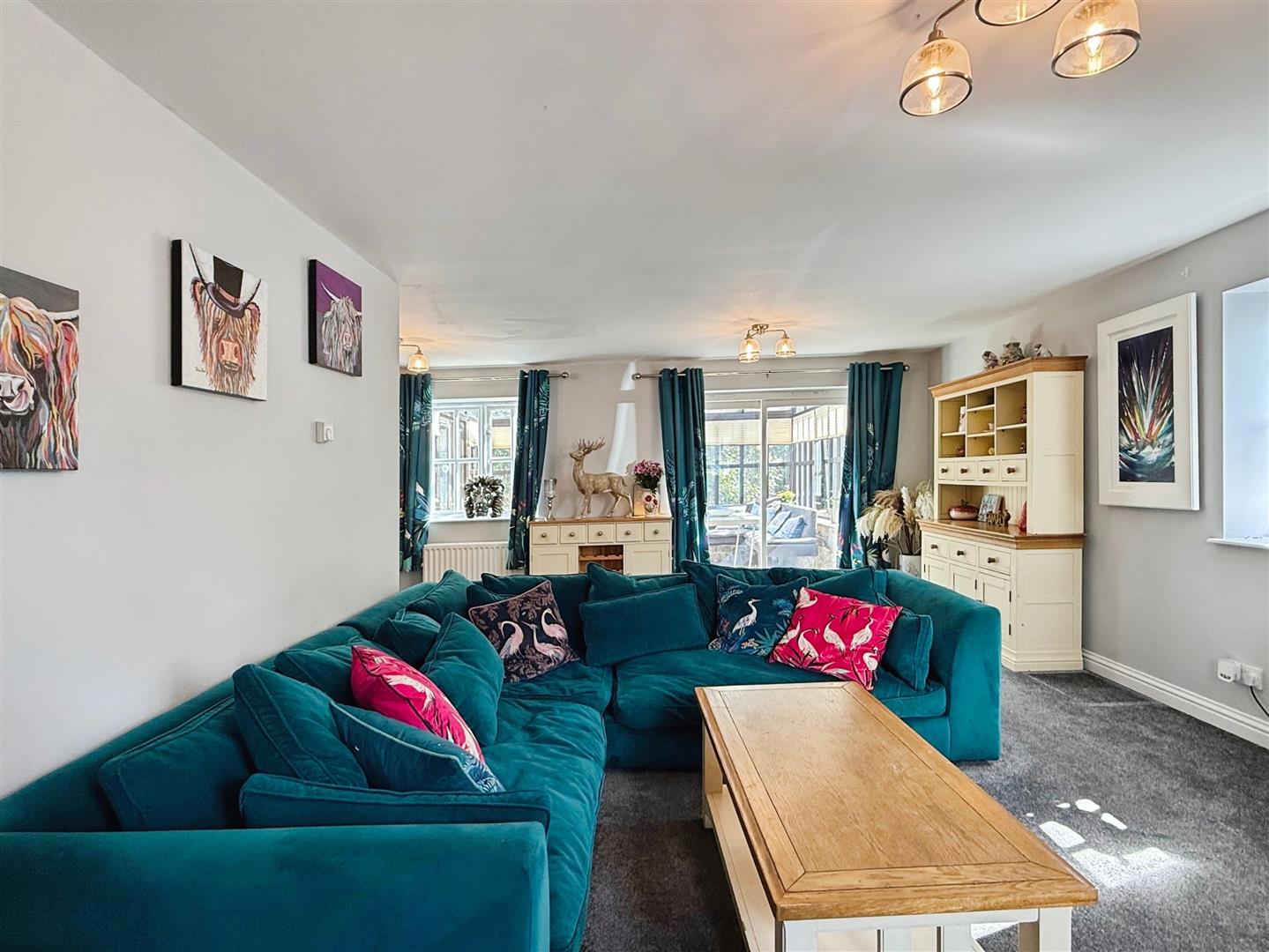 L-Shaped Lounge With Dining Area - 6.70 x 4.02 min 6.06 max (21'11" x 13'2" min 19'1 - The lounge features an inviting L-shaped design, combining both lounge and dining areas. The lounge section has a fitted carpet and includes a log effect fire with an attractive surround. Double-glazed windows to the front and side aspects allow for ample natural light, complemented by a radiator and a central light fixture. The open-plan dining area features sliding doors leading into the conservatory, which is filled with light and offers additional space for entertaining.