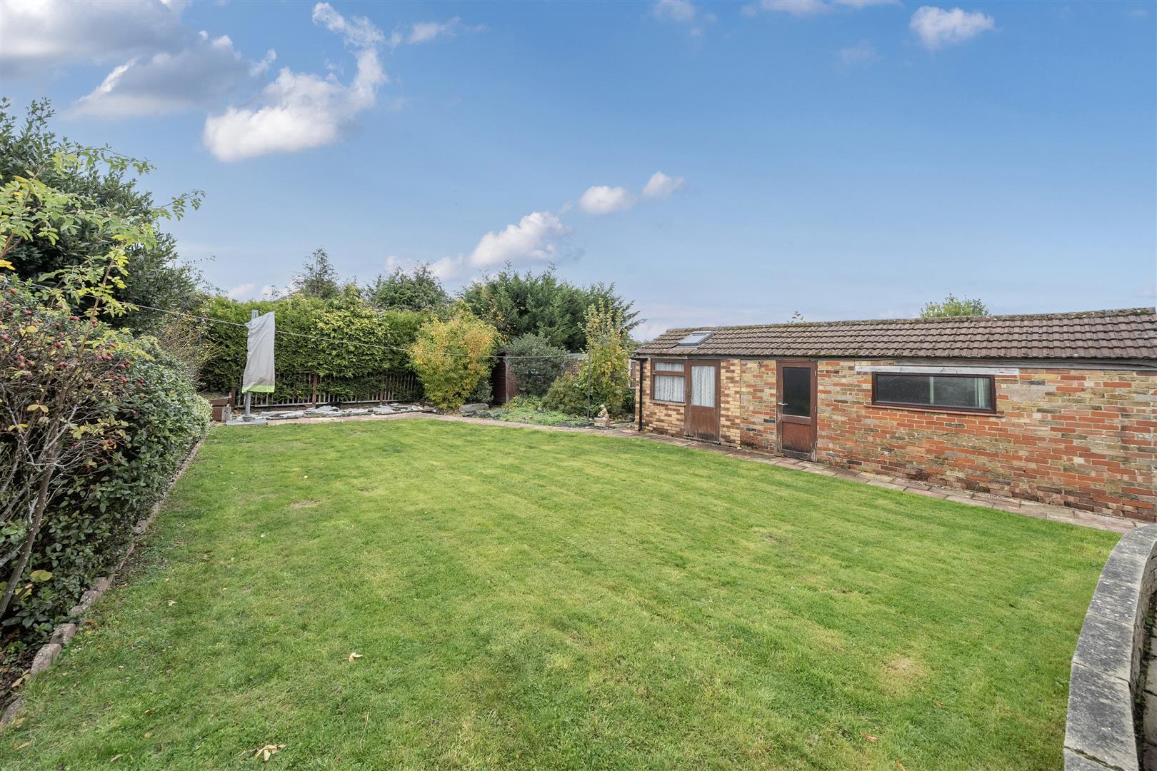 Outside - Rear - patio area with retaining wall. area of grass, Fenced boundaries with shrubs. Brick garage and shed to right hand side with gated access to front drive.