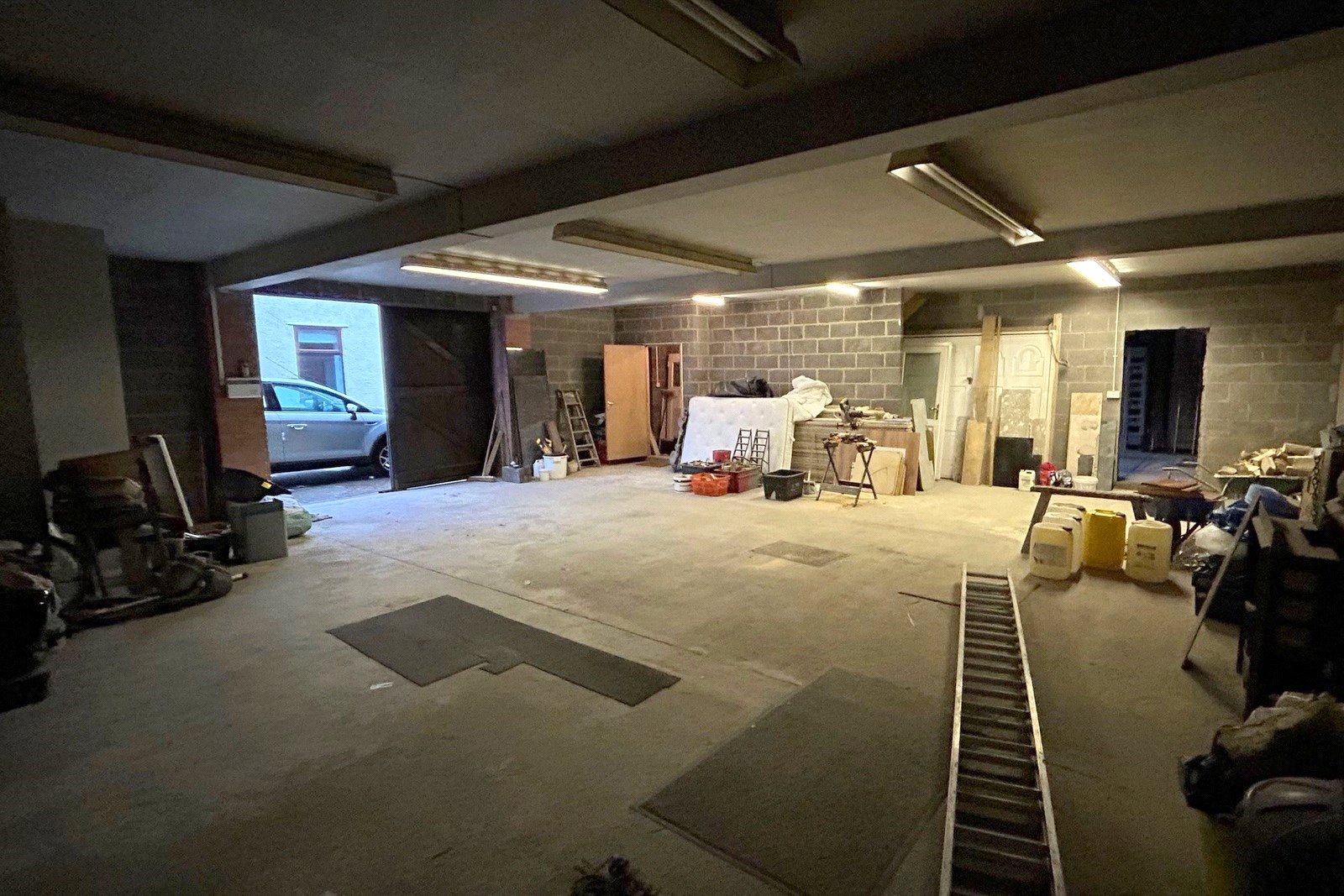 Warehouse 60' x 34' (18.3m x 10.36m). A huge space currently divided into four sections (two to the ground floor and two to the first floor) with staircases at each end. Plus a double garage with electric door. All with light and power supply. No heating.