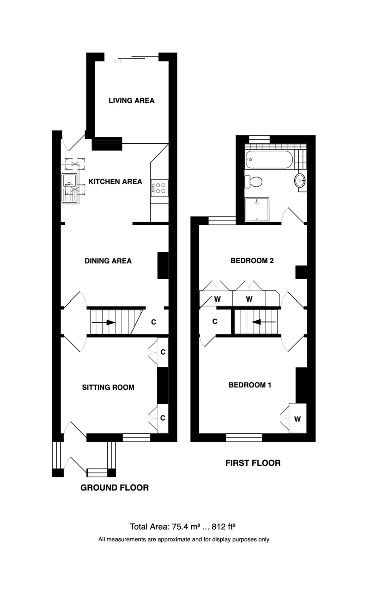 Upstairs, the main bedroom enjoys lovely views over the green, while the second bedroom-currently offering through-access-could easily be separated to create a more traditional layout. A spacious, well-appointed bathroom includes a separate shower.