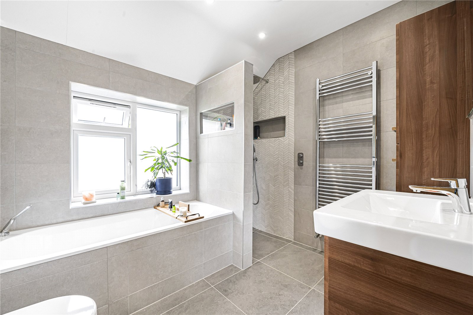 En-suite Bathroom: Bespoke modern and stylish suite of sanitary ware comprising double ended bath, walk in shower enclosure with hand held and fixed shower heads, WC with concealed cistern and wide vanity unit with wash hand basin. Tiled floor, ladder radiator, display niche cabinet and shelf.