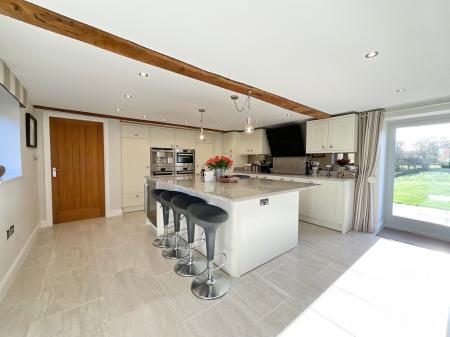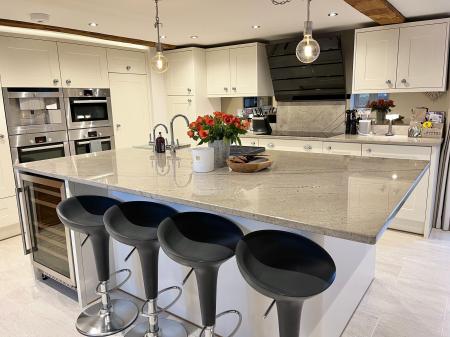 - Statement kitchen with high-spec integrated appliances, Silestone island, wine fridge, Belfast sink, and sociable seating area.