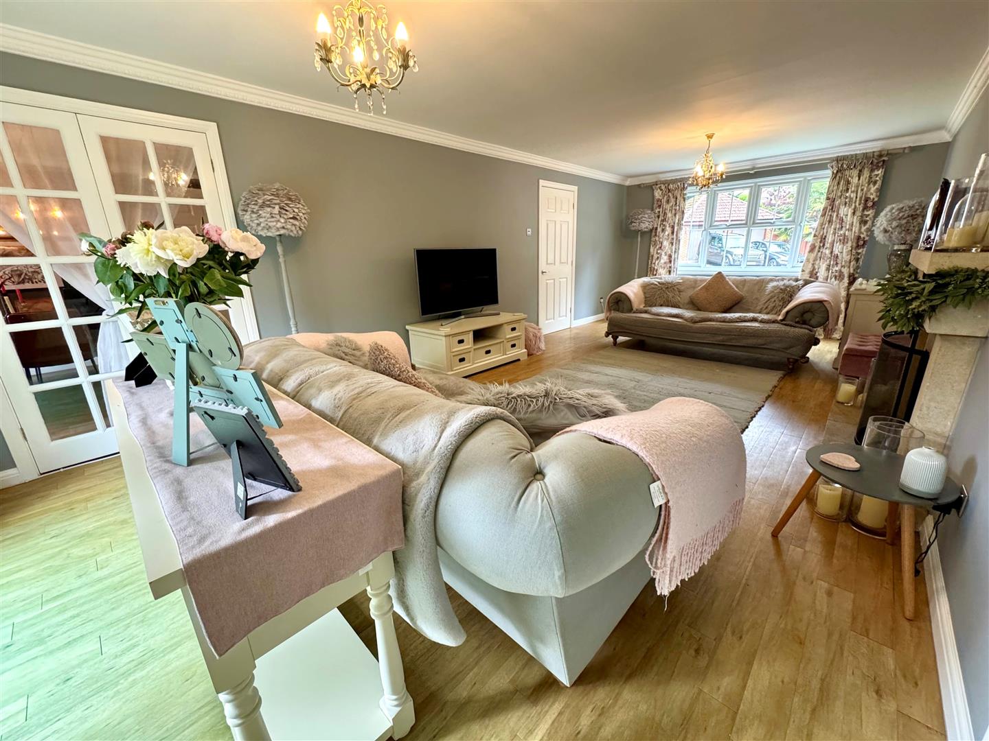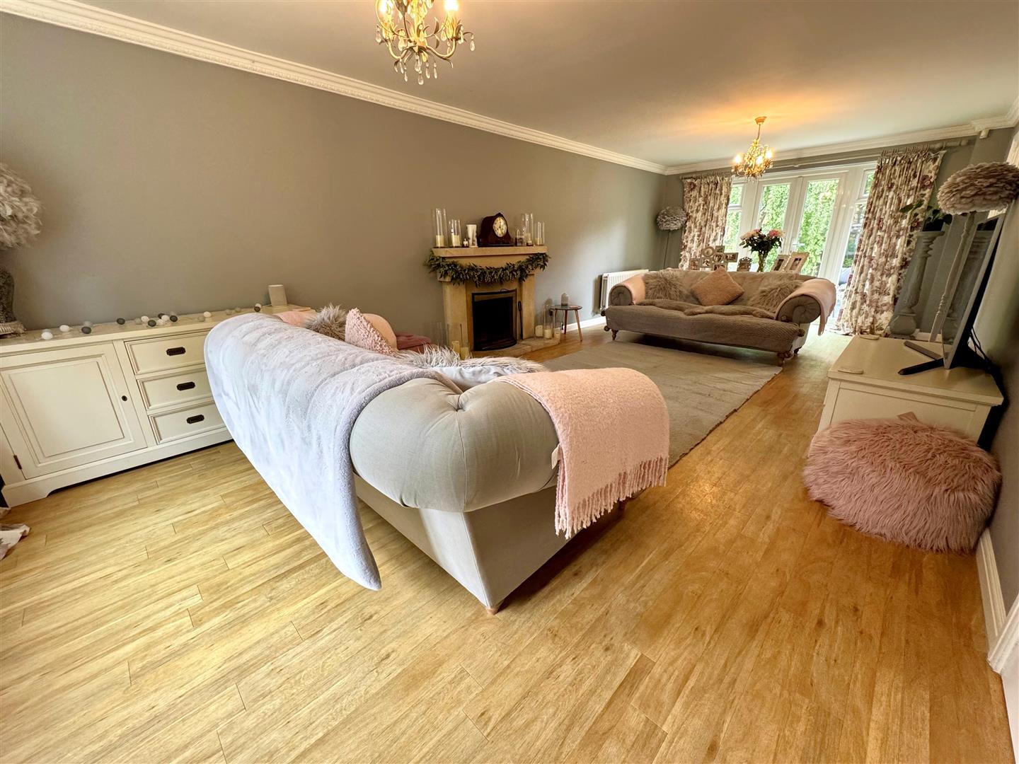 26'7ft dual aspect lounge with impressive stone open fireplace & double doors out onto the rear garden