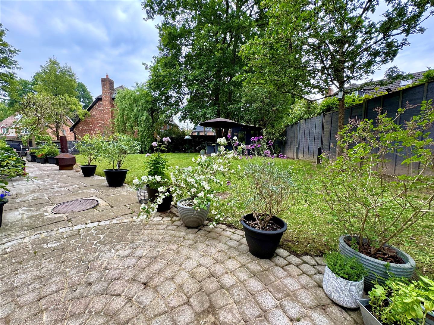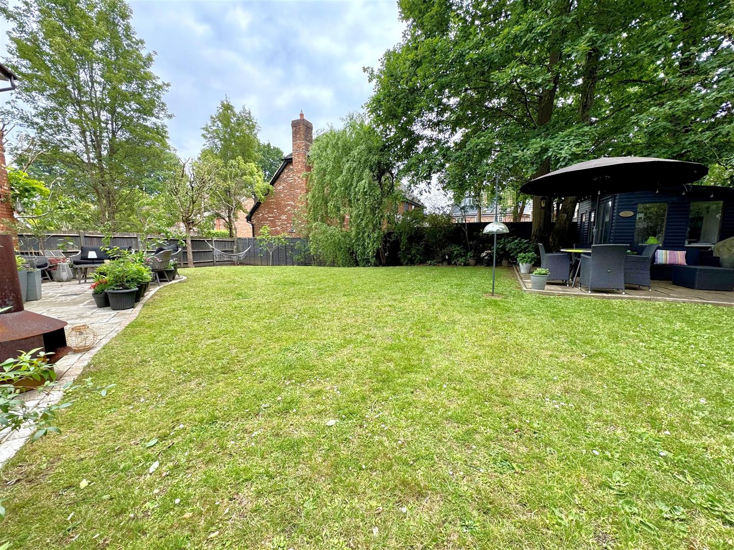 Rear enclosed landscaped garden with majority laid to lawn, paved patio areas & summer house to remain